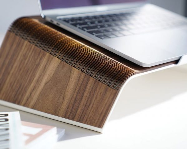 De stand is gemaakt van Amerikaans walnotenhout in combinatie met wit gehard staal. Onder op de stand zit kurk zodat je hem (bijna) altijd en overal neer kunt zetten zonder krassen te veroorzaken. We kunnen ons voorstellen dat je deze laptopstandaard in de woonkamer op de eettafel neerzet, al is het maar tijdelijk voor je werk of gewoon om naar te kijken.