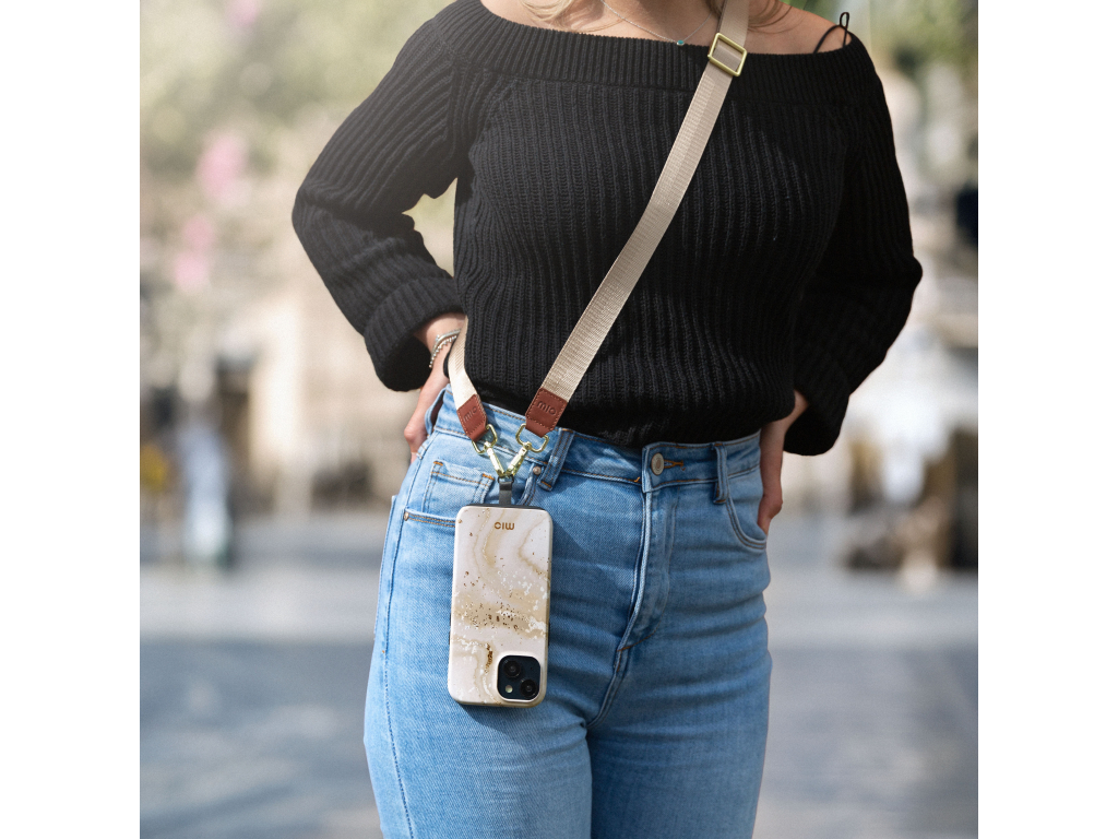 Elke Mio Lanyard is zorgvuldig afgewerkt met elegante leren details, die een vleugje luxe en duurzaamheid toevoegen. De metalen haakjes, ontworpen voor gemak en veiligheid, zorgen ervoor dat je smartphone altijd binnen handbereik is, zonder in te leveren op stijl.