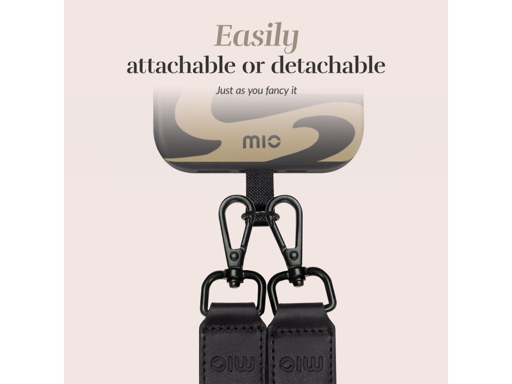 Elke Mio Lanyard is zorgvuldig afgewerkt met elegante leren details, die een vleugje luxe en duurzaamheid toevoegen. De metalen haakjes, ontworpen voor gemak en veiligheid, zorgen ervoor dat je smartphone altijd binnen handbereik is, zonder in te leveren op stijl.