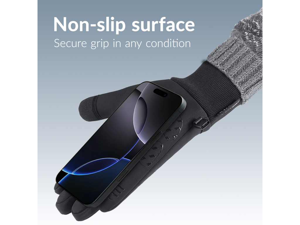 De binnenkant is uitgerust met non-slip siliconen pads, waardoor je een stevige grip hebt op je telefoon of andere accessoires. De speciale touchscreen-compatibele vingertoppen maken nauwkeurige bediening mogelijk zonder in te leveren op comfort.