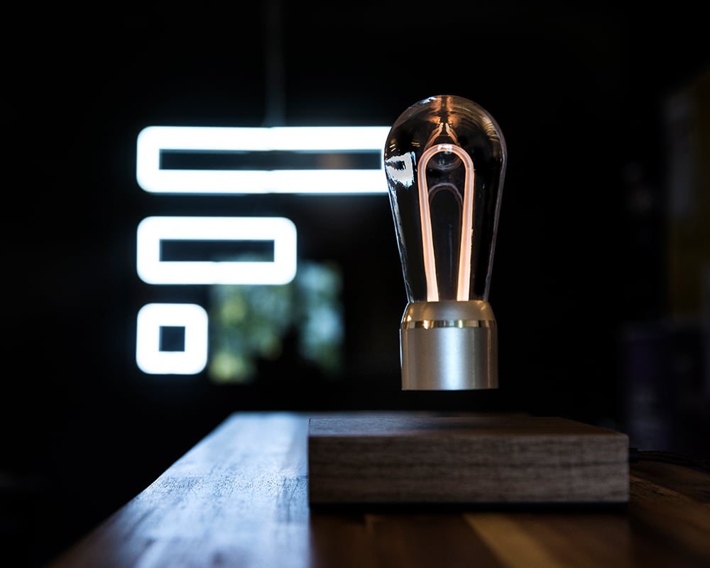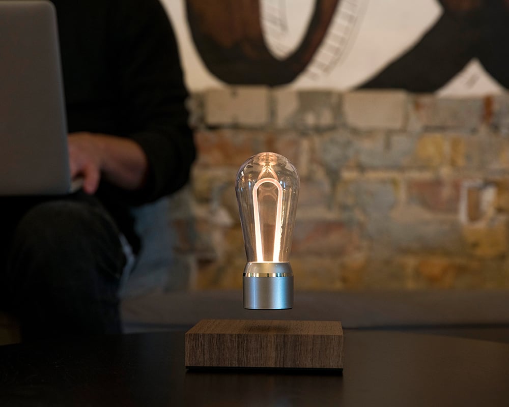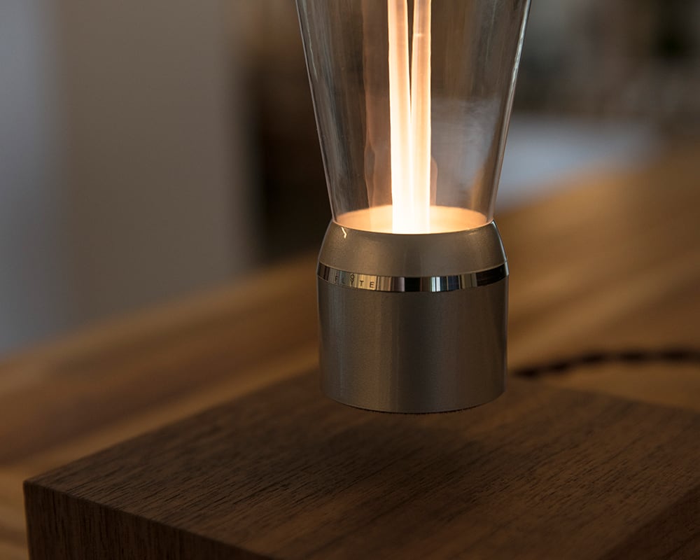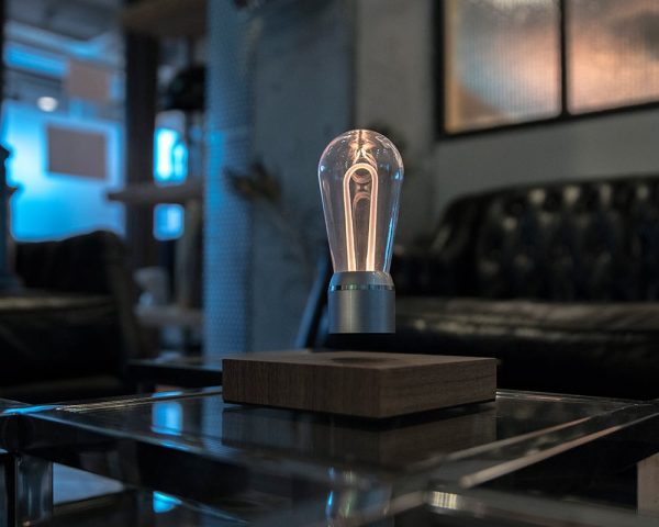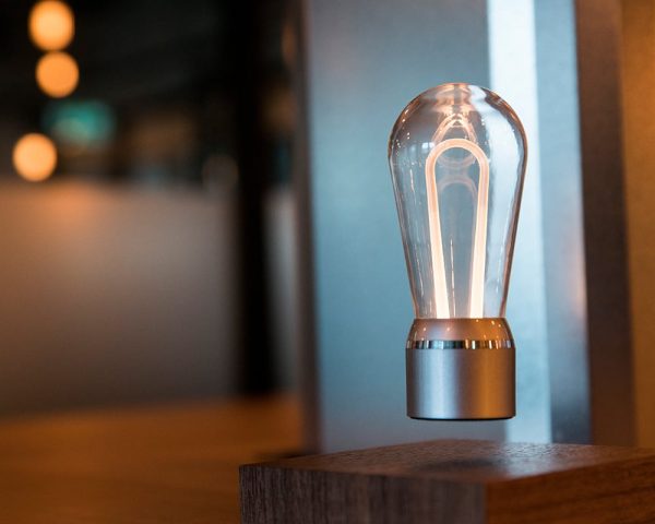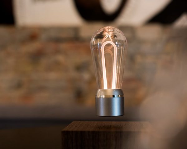 Door het perfect uitgebalanceerde magnetische veld blijft de lamp op zijn plek en wordt het voorzien van energie waardoor hij ook nog licht geeft. De toekomst is nu, dat is duidelijk.