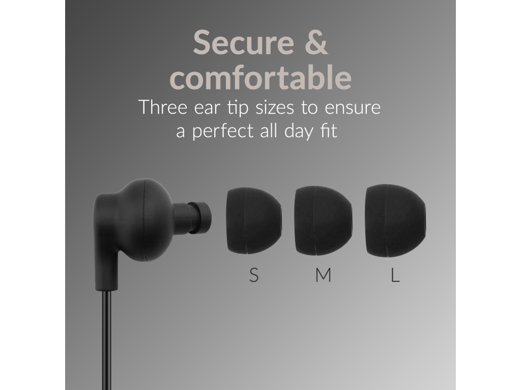De headset wordt geleverd met drie sets siliconen eartips in verschillende maten, zodat je altijd de pasvorm vindt die het beste bij je past.