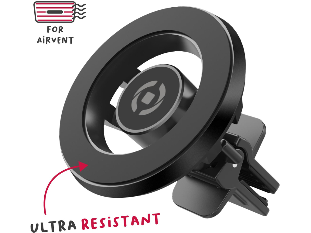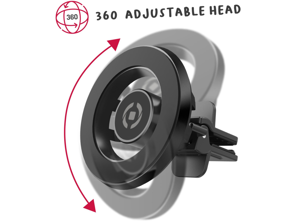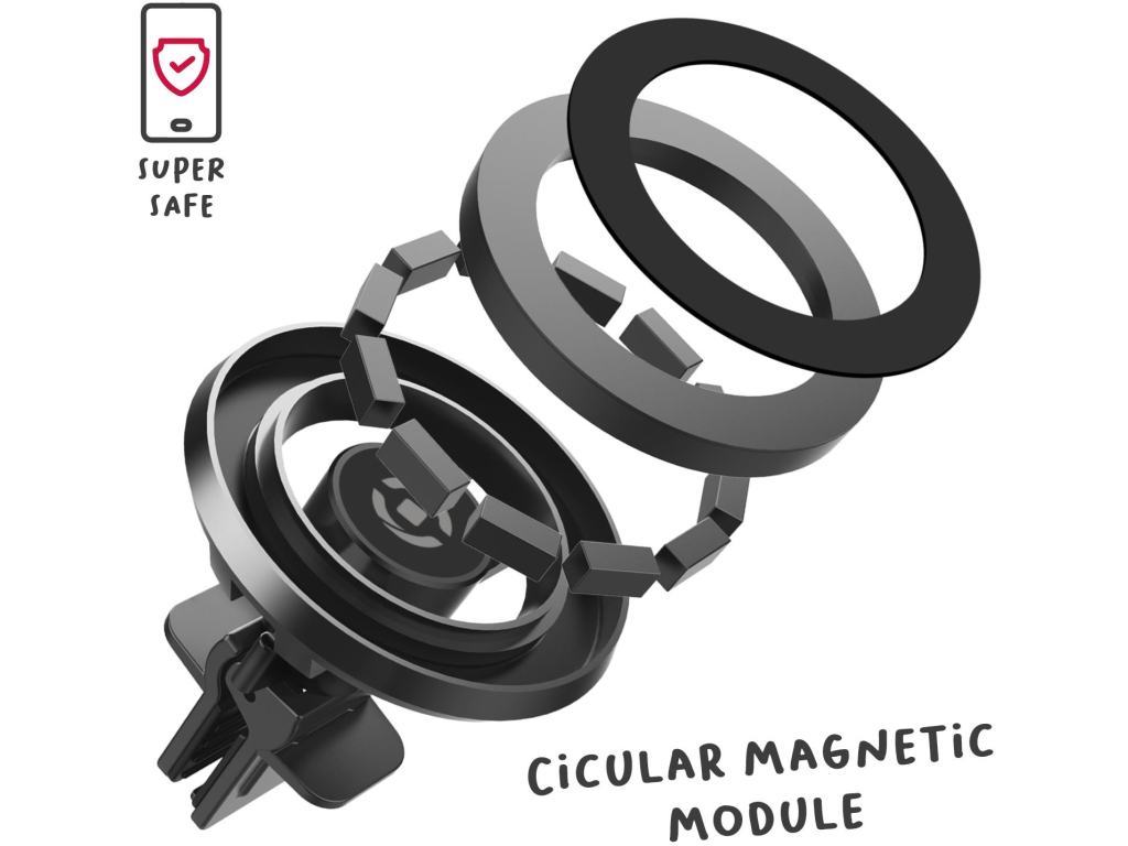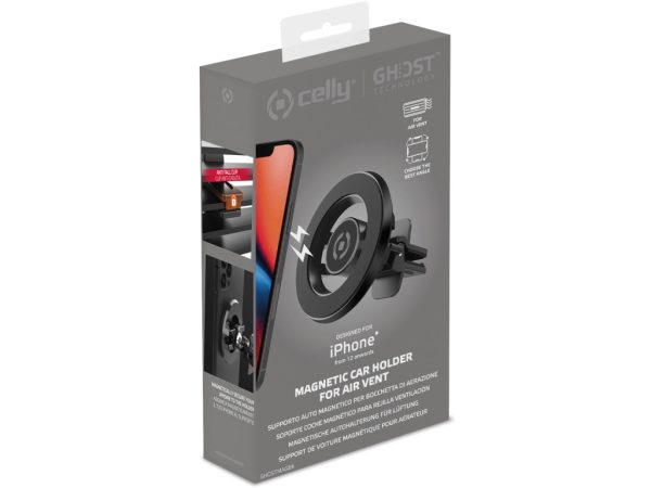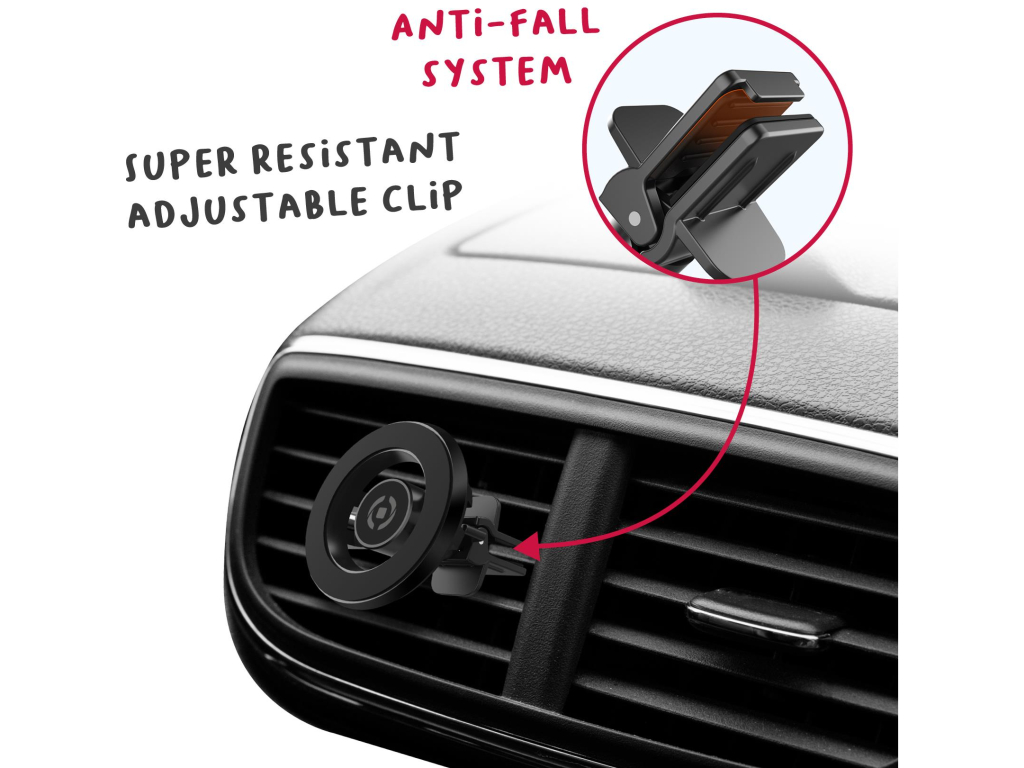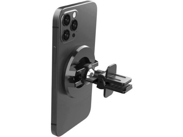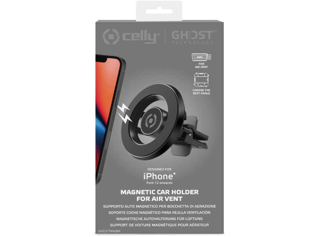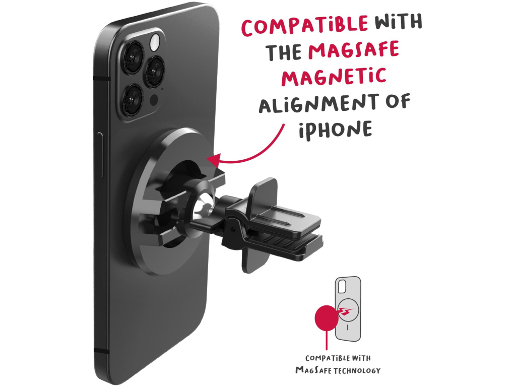 De Celly GhostMag MagSafe Car Holder Black is compatible met het MagSafe ecosysteem van Apple. Je iPhone en iPhone-cases klikken dus moeiteloos vast aan deze magnetische houder van Celly. De houder heeft een verstelbare clip met anti-fall systeem die er samen voor zorgen dat de houder goed vast zit aan het luchtrooster van jouw auto.