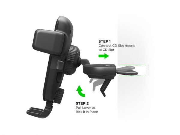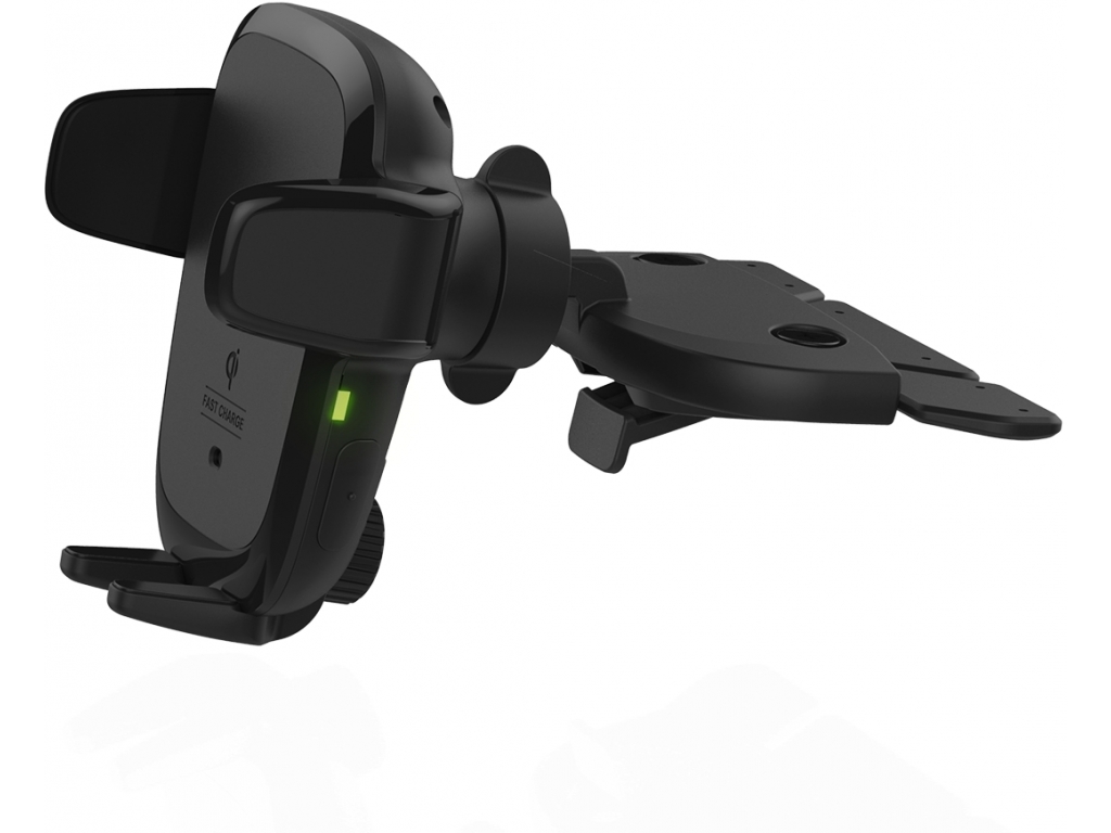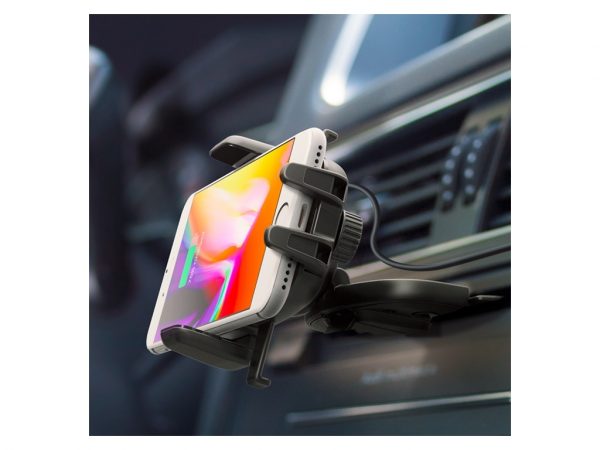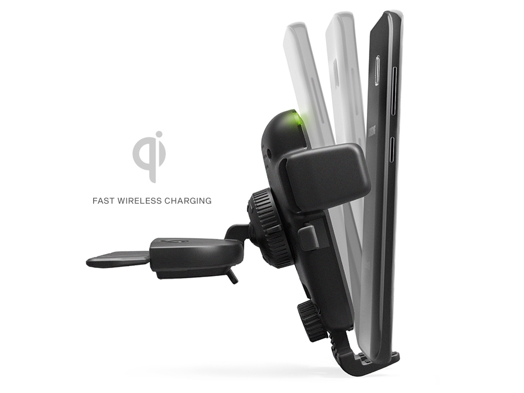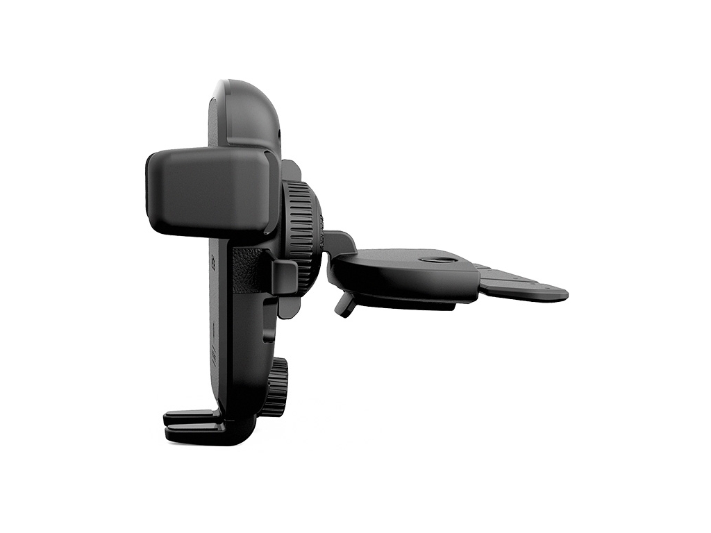 De hoogte van de voet waar het toestel op steunt is in te stellen zodat de houder jouw toestel zo goed mogelijk kan klemmen. Het kogelgewricht maakt het mogelijk om de houder in bijna elke hoek te draaien. Met een druk op 2 knoppen aan de zijkanten van de houder laten de armen het toestel los zodat je het toestel makkelijk uit de houder kunt nemen. Deze houder kan je in de cd-lade van jouw autoradio bevestigen.