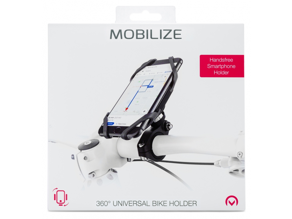 De Universele 360° Bike Holder van Mobilize is dé oplossing om uw mobiel handsfree te gebruiken op de fiets. De houder is universeel en dus passen vrijwel alle smartphones (vanaf 12cm x 6cm). Waar andere modellen vaak van alleen maar zacht of alleen maar hard materiaal zijn gemaakt bestaat de Mobilize Bike Holder uit een perfecte mix van materialen voor optimale bescherming en gebruikersgemak. Dankzij de harde achterkant met siliconen oppervlak, de rubberen hoeken, de stevige mount met metalen onderdelen, zal een smartphone stevig en veilig op de houder vast blijven zitten, zelfs tijdens fietsen over ruig terrein of extreme hobbelwegen. U krijgt er drie rubberen bevestigingsringen bij in verschillende formaten. Hiermee heeft u voor vrijwel elk fietsstuur de juiste bevestiging. Het vast maken van de houder op uw fiets is eenvoudig en in de doos zit alles wat u nodig hebt om meteen op pad te kunnen.