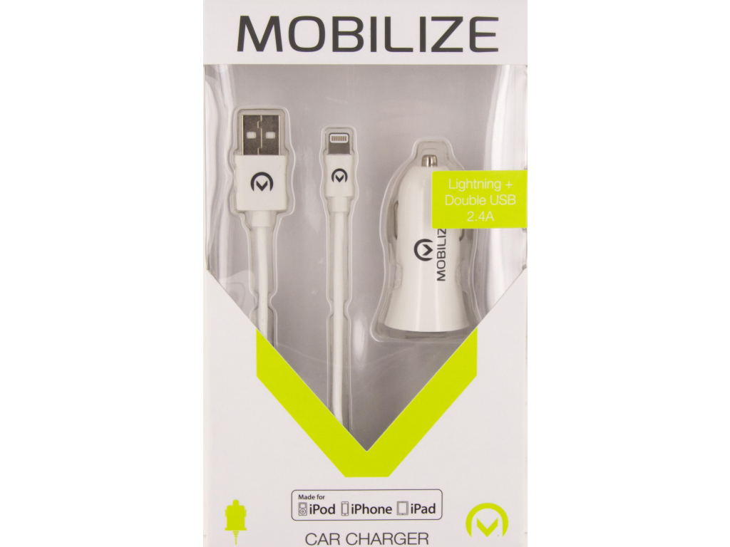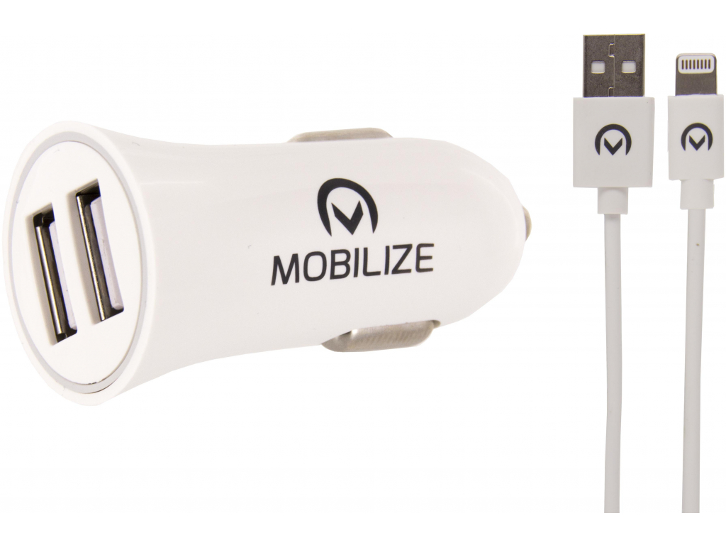 Mobilize Car Charger 2x USB 24W + USB to Apple MFi Lighting Cable 1m. White