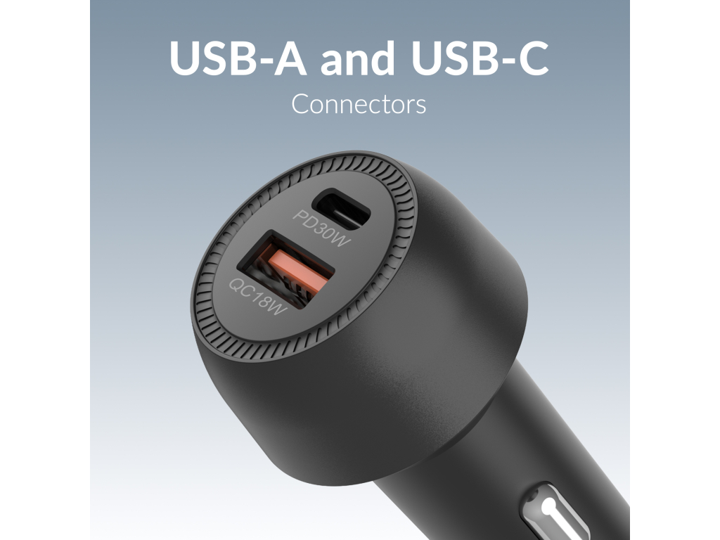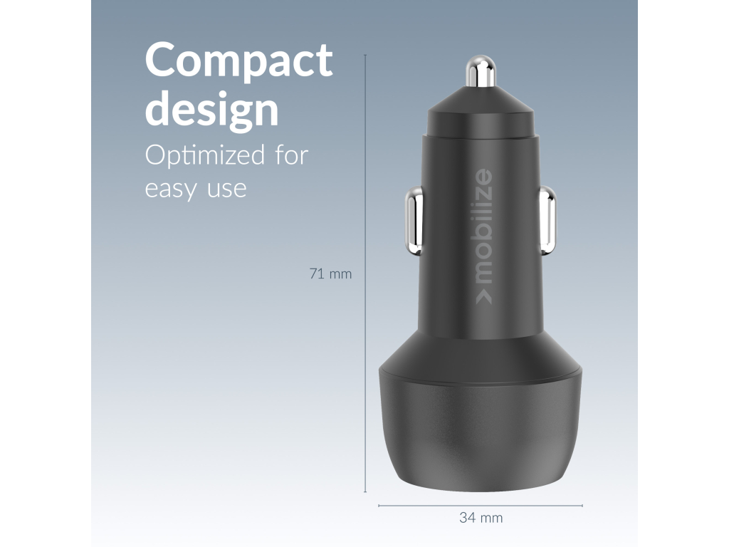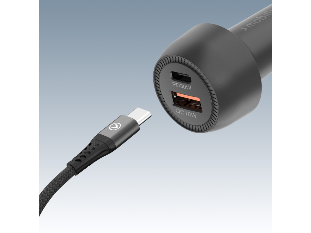 De Mobilize Car Charger is een uiterst compacte en krachtige lader voor in de auto. Met 48W PD/PPS en Quick Charge 3.0 zorgt deze lader ervoor dat jouw apparaten snel en veilig worden opgeladen. De lader beschikt over zowel een USB-A als een USB-C aansluiting, waardoor je vrijwel elke kabel kunt aansluiten. Met deze lader laad je je toestel in minder dan 30 minuten op van 0% naar 50%.