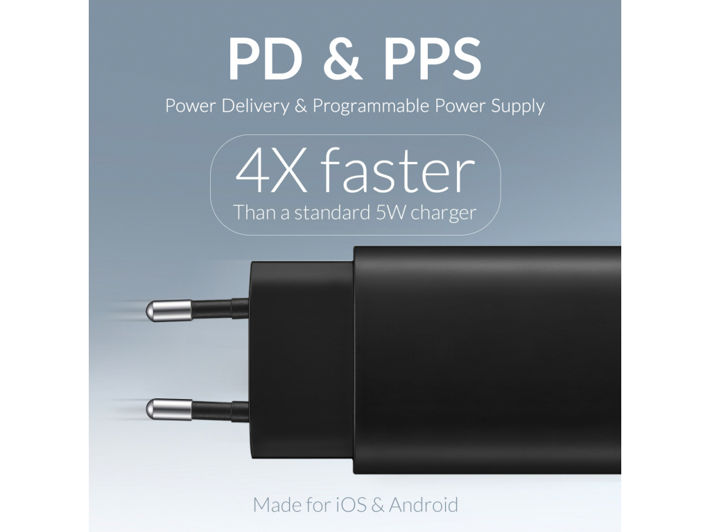 USB PPS, of "usb power delivery programmable power supply", is een programmeerbaar protocol dat de laadsnelheid aanpast aan de behoeften van je toestel. Dit betekent dat als je accu bijna leeg is en je toestel een hoge input nodig heeft, de lader de benodigde output levert. Hoe voller de accu, hoe minder input het toestel nodig heeft. Met PPS wordt je toestel zo efficiënt mogelijk opgeladen, waardoor er minder warmte wordt geproduceerd en je accu langer meegaat.