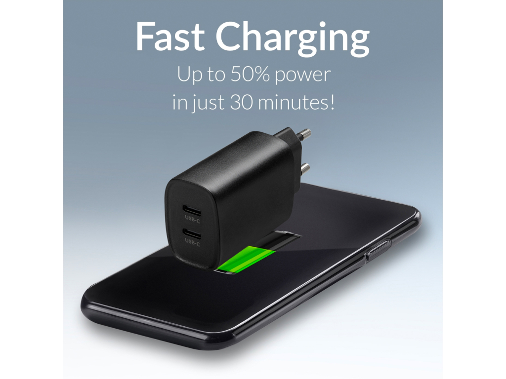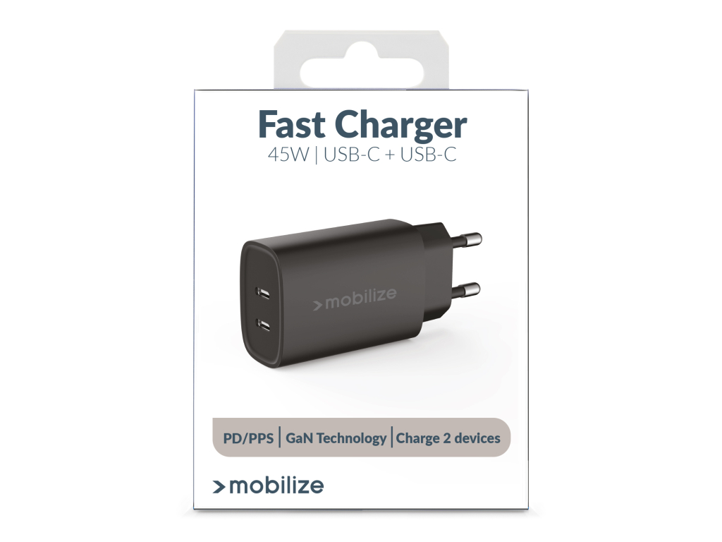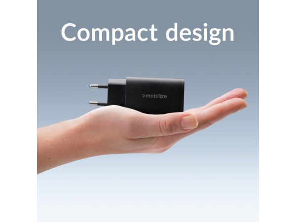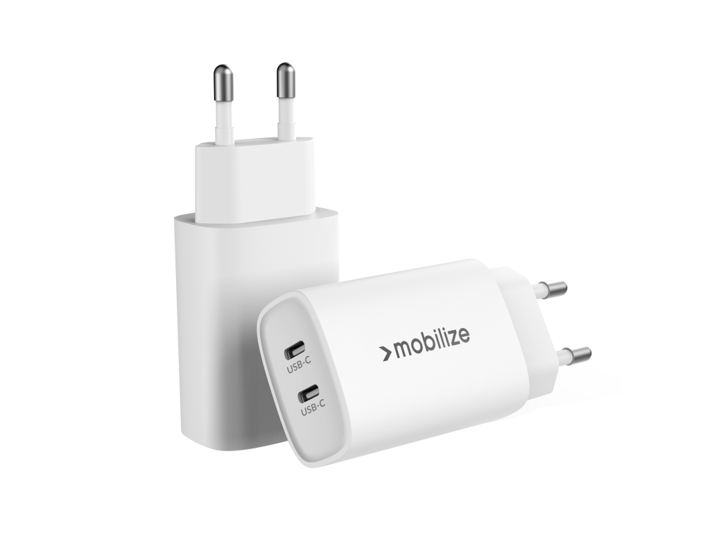 Ontmoet de Mobilize Wall Charger, jouw nieuwe, USB-C lader voor het stopcontact. Met twee USB-C poorten en een totaal vermogen van 45W, is deze lader een krachtig accessoire voor al je apparaten. Deze slimme en veilige lader maakt gebruik van PD/PPS technologie, waarmee je jouw apparaat in minder dan 30 minuten van 0% naar 50% kunt opladen.
