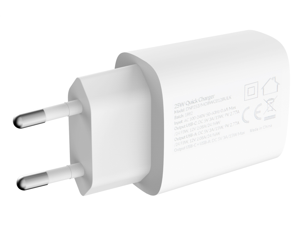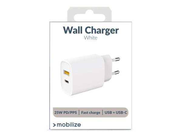 De Mobilize Mobilize Wall Charger USB-C + USB 25W charger is een uiterst complete charger voor thuis, kantoor of op vakantie. Met 25W PD/PPS en Fast Charge is het een snelle lader die altijd precies levert wat jouw toestel vraagt. Wanneer je één toestel laadt zij het via USB-C of USB-A dan wordt jouw toestel altijd met maximaal 25W opgeladen wanneer jouw toestel daar om vraagt. Ga je twee toestellen tegelijk laden en beide poorten gebruiken dan is er maximaal 15W beschikbaar verdeelt over de twee poorten.