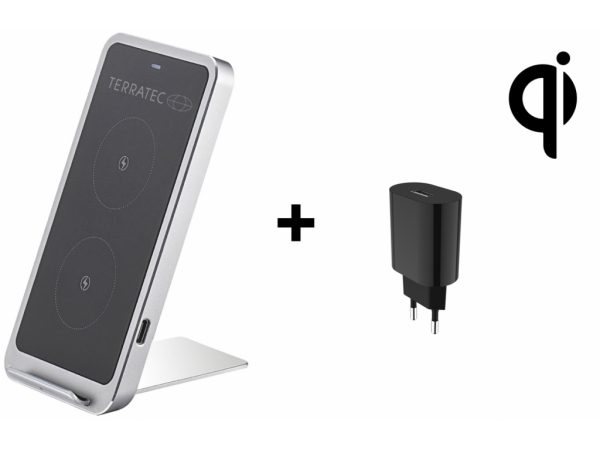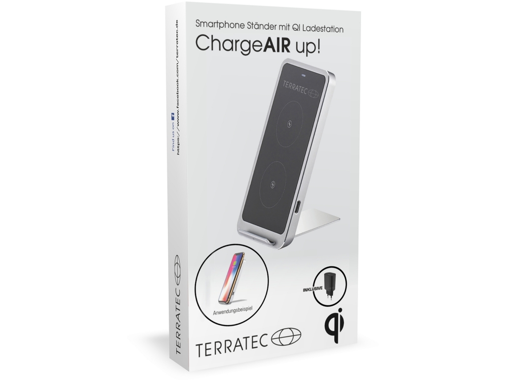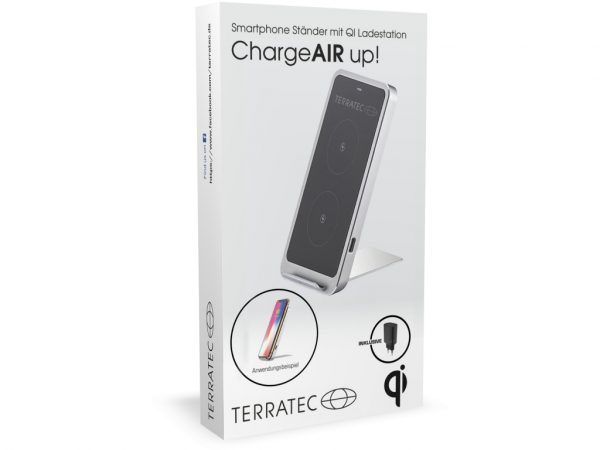 De TERRATEC ChargeAIR up! voorziet alle compatibele smartphones draadloos van energie dankzij de inductieve oplaadfunctie. De standaard biedt een hoogwaardig ontwerp en een inductie-oppervlak met een output tot 10W, waardoor smartphones supersnel worden opgeladen zonder een kabel te gebruiken – eenvoudig door deze in de houder te plaatsen. Het met rubber beklede oppervlak zorgt voor een veilige stand. Omdat de TERRATEC is uitgerust met twee inductiespoelen, kan de smartphone zowel horizontaal als verticaal worden opgeladen – perfect om op te laden tijdens het bekijken van een video. Door de oplaadafstand van 9 mm kan de telefoon tijdens het opladen in het hoesje blijven.