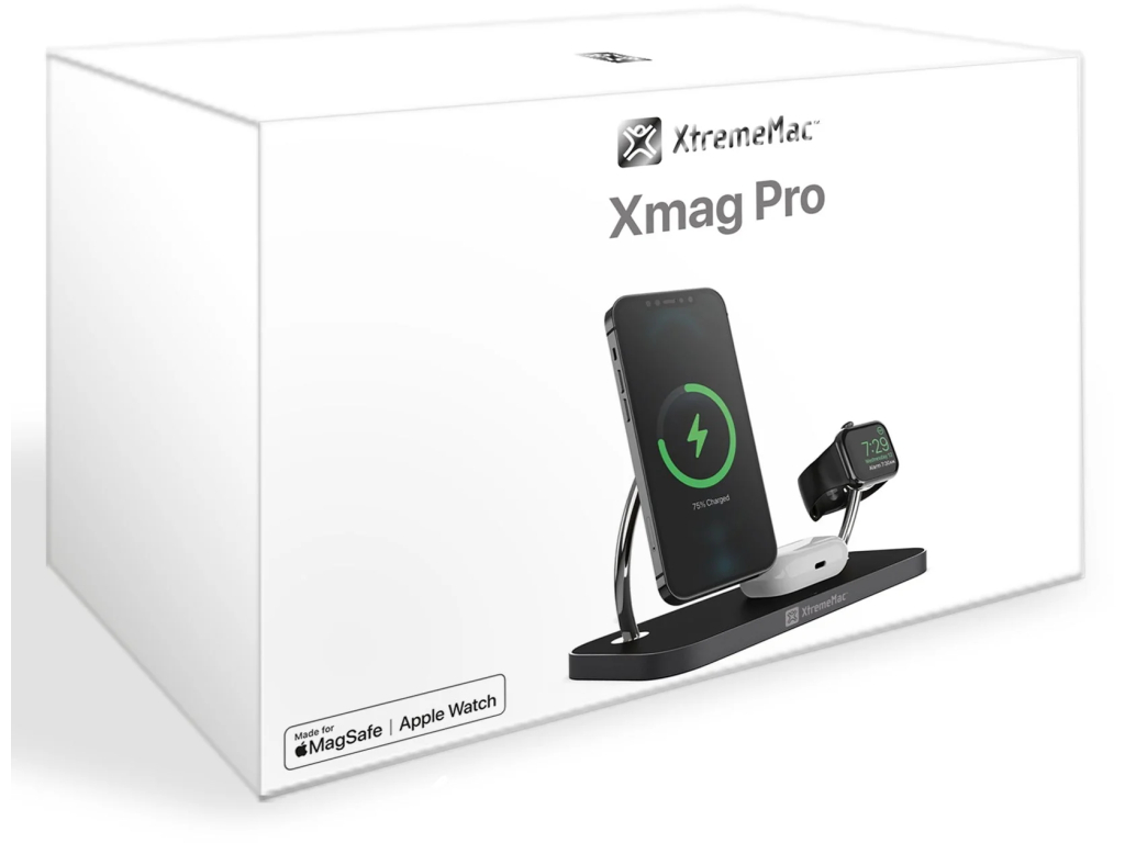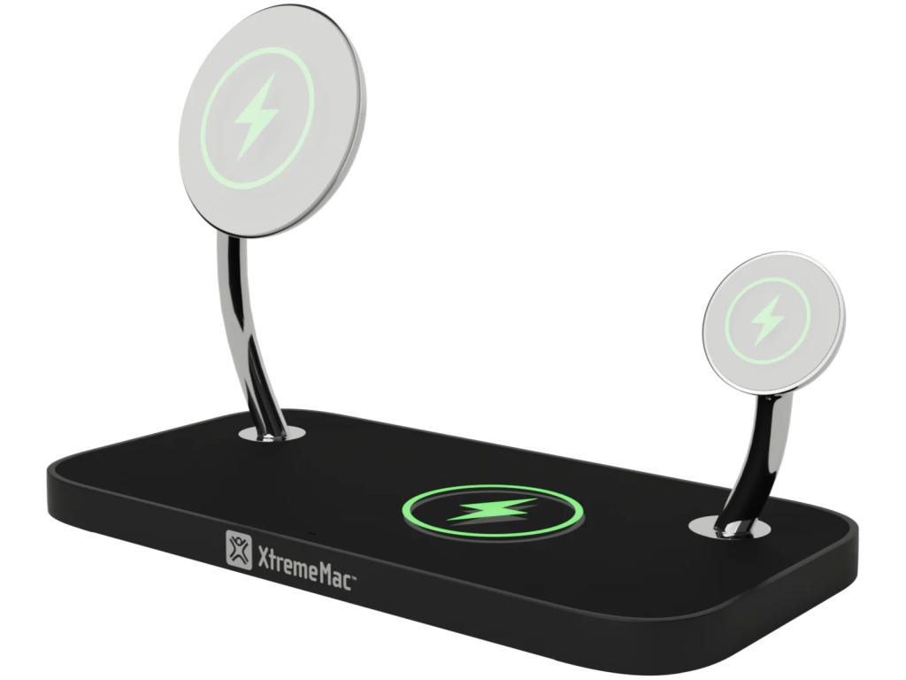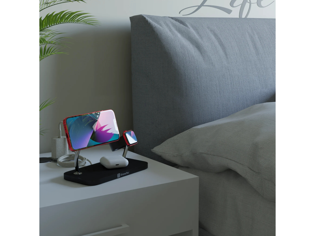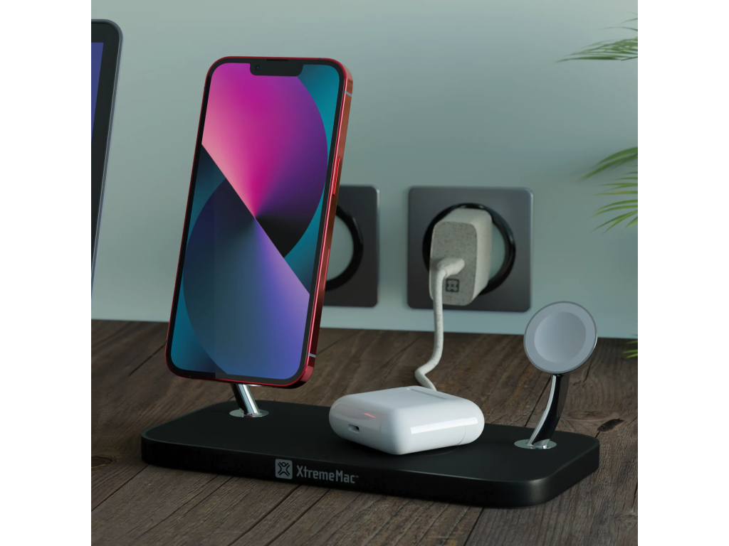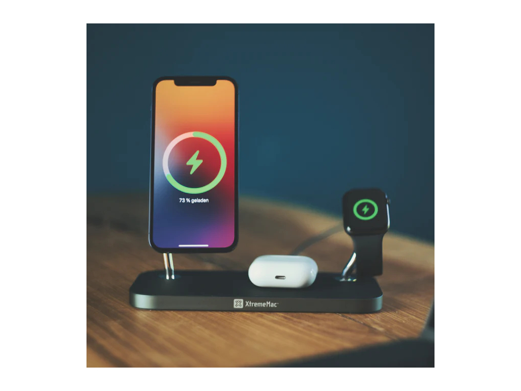 Maak kennis met het nieuwe XtremeMac 3-in-1 docking station, jouw ultieme oplaadoplossing. Dit docking station voorziet jou van alles wat je nodig hebt om je iPhone met MagSafe, AirPods hoesje en Apple Watch tegelijkertijd en draadloos op de hoogste snelheid op te laden.