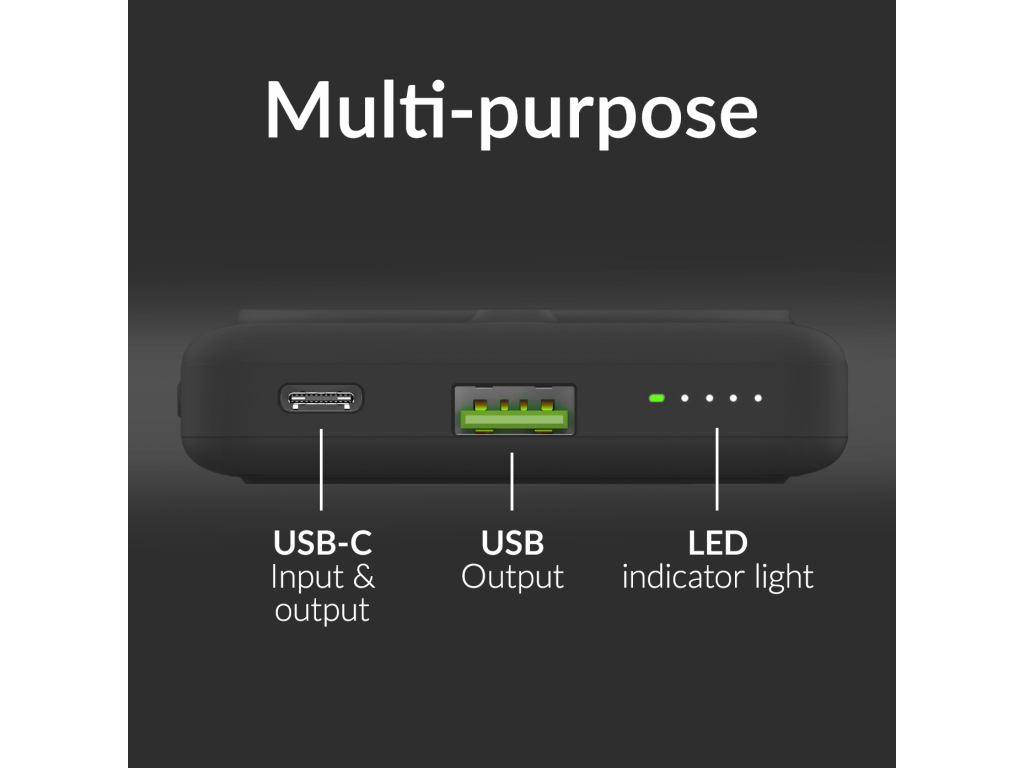 Het heeft een USB-A output voor traditioneel opladen, en een USB-C poort die zowel als input als output kan dienen, wat de Mobilize Magnetic Wireless Power Bank zeer veelzijdig maakt.