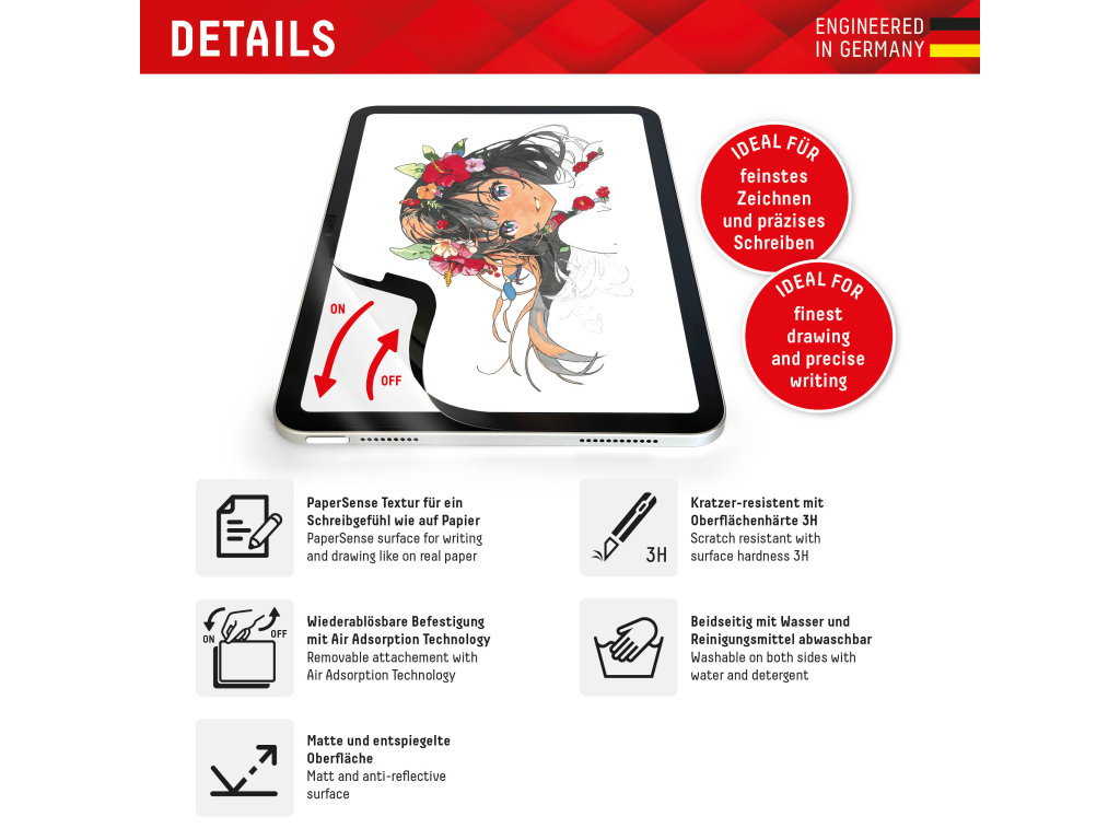 Dankzij de Air Adsorption Technology is de Tablet PaperSense beschermfolie snel en eenvoudig aan te brengen en te verwijderen – volledig zonder lijm.