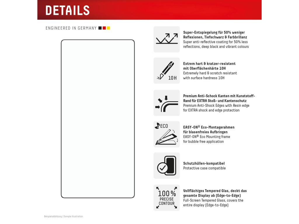 Zodra het beschermglas is aangebracht, zorgt de hoogwaardige lijmlaag voor perfecte hechting en een helder beeld. De lijm is afgestemd op de coatings van displays van verschillende fabrikanten, zodat de folie langdurig stevig blijft zitten. En ook het uiterlijk blijft behouden: dankzij de hoge transparantie en kleurweergave geniet je van indrukwekkende video's en foto's.