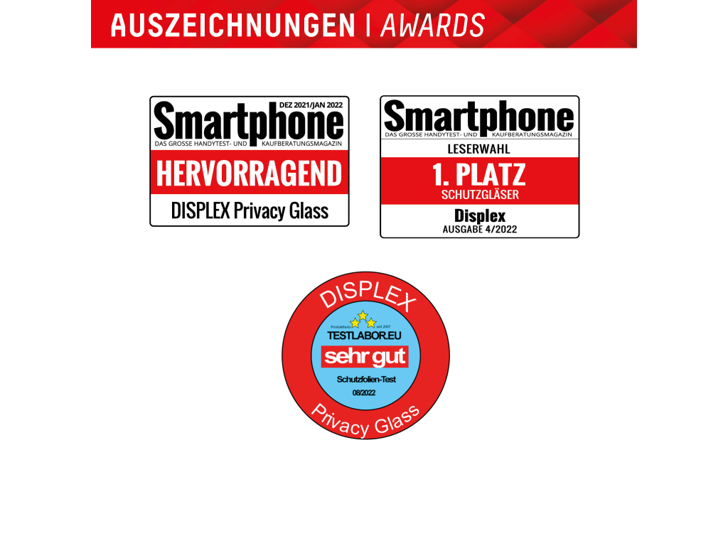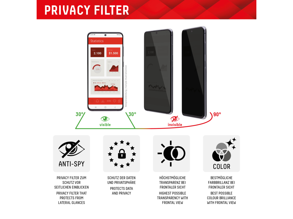 Dankzij het speciale privacyfilter dat is geïntegreerd in het beschermglas, wordt het schermlicht alleen doorgegeven vanuit een bepaald kijkhoek. Dit betekent dat het scherm zwart lijkt vanaf een kijkhoek van 30° of meer. Het glas biedt zo een doeltreffende bescherming tegen nieuwsgierige blikken van bijvoorbeeld medereizigers in treinen, vliegtuigen of bussen. En dat alles zonder negatieve invloed op kleurweergave of beeldkwaliteit. Als je gevoelige gegevens op je smartphone opslaat of bewerkt – zakelijk of privé – is het Privacy Glass een verstandige keuze.