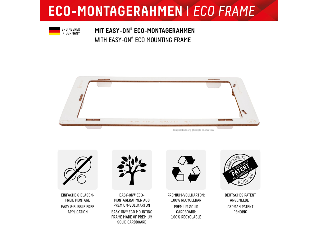Met het EASY-ON® Eco Montageframe en de bijbehorende videotutorials is het aanbrengen van het geharde glas snel, eenvoudig en nauwkeurig. Het montageframe is gemaakt van hoogwaardig, stevig karton en is daardoor niet alleen duurzaam, maar ook 100% recyclebaar. Het resultaat mag er zijn: geen scheef geplakt glas, geen bedekte openingen voor microfoons of luidsprekers en vooral géén luchtbellen onder het glas.