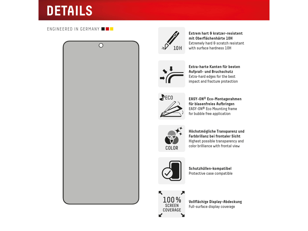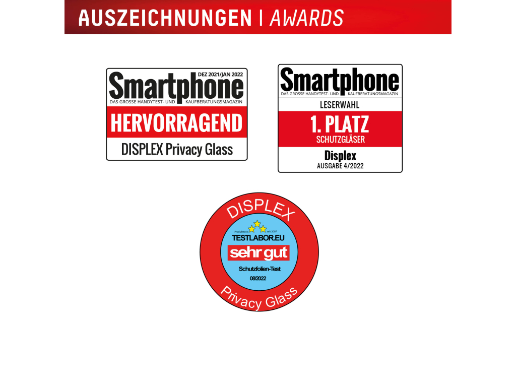 Dankzij het speciale privacyfilter dat is geïntegreerd in het beschermglas, wordt het schermlicht alleen doorgegeven vanuit een bepaald kijkhoek. Dit betekent dat het scherm zwart lijkt vanaf een kijkhoek van 30° of meer. Het glas biedt zo een doeltreffende bescherming tegen nieuwsgierige blikken van bijvoorbeeld medereizigers in treinen, vliegtuigen of bussen. En dat alles zonder negatieve invloed op kleurweergave of beeldkwaliteit. Als je gevoelige gegevens op je smartphone opslaat of bewerkt – zakelijk of privé – is het Privacy Glass een verstandige keuze.