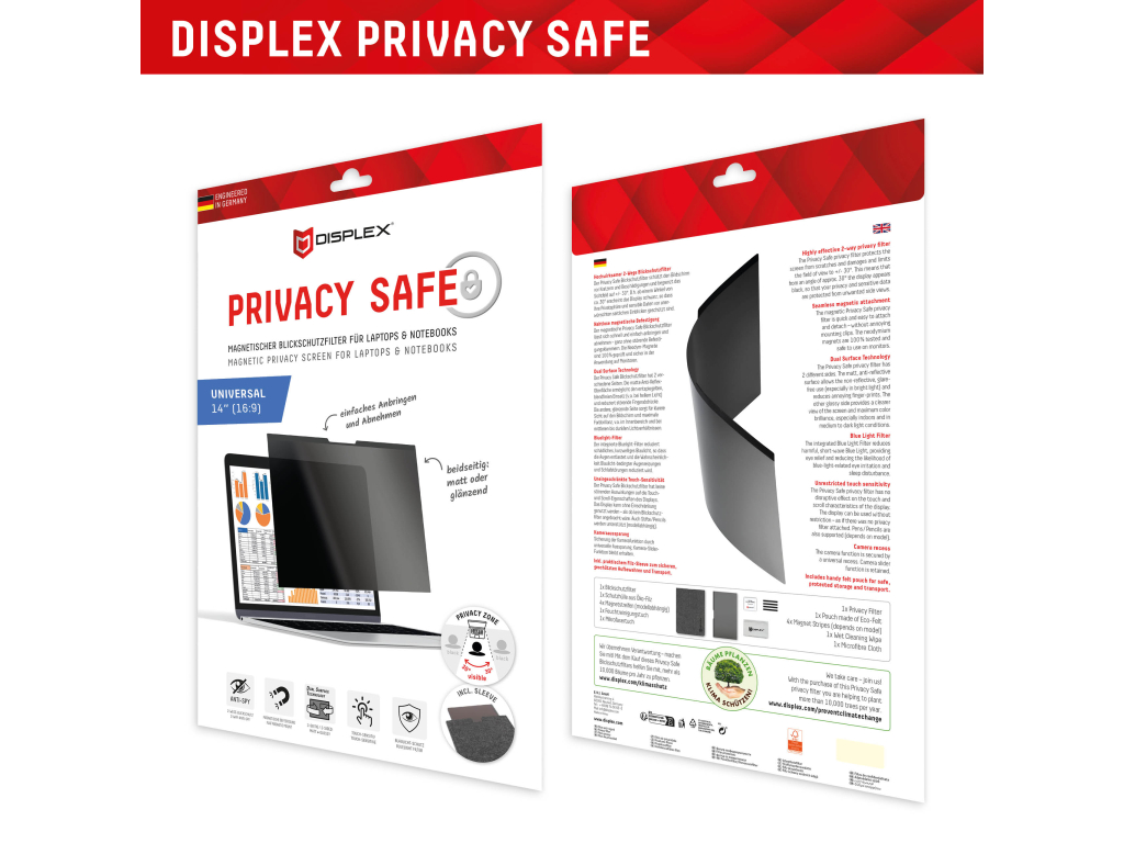 De Privacy Safe privacy-filter beschermt het scherm tegen krassen en schade en beperkt het zichtveld tot +/- 30°. Dit betekent dat vanuit een hoek van ongeveer 30° het scherm zwart lijkt, zodat jouw privacy en gevoelige gegevens beschermd zijn tegen ongewenste zijdelingse blikken.