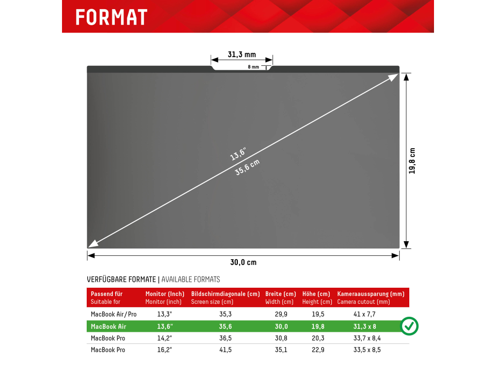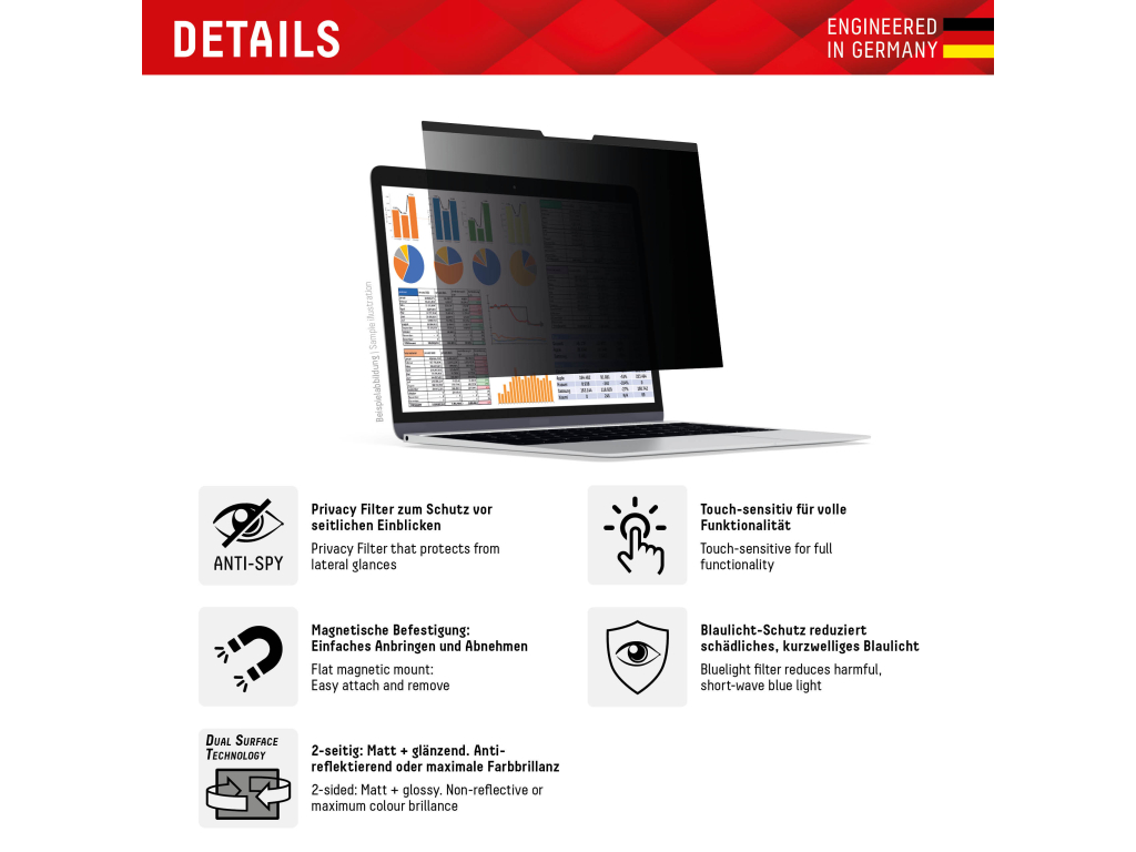 De Privacy Safe privacy-filter beschermt het scherm tegen krassen en schade en beperkt het zichtveld tot +/- 30°. Dit betekent dat vanuit een hoek van ongeveer 30° het scherm zwart lijkt, zodat jouw privacy en gevoelige gegevens beschermd zijn tegen ongewenste zijdelingse blikken.