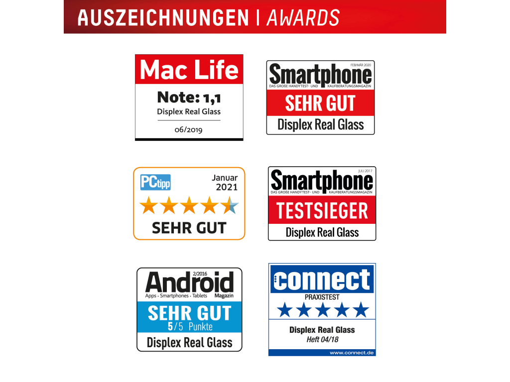 Ons Displex beschermglas is tot op 5/100 mm nauwkeurig afgestemd op de contouren van de smartphone en past daardoor perfect. Bovendien is het glas met slechts 0,3 mm ultradun. Hierdoor kunnen alle standaardformaat beschermhoesjes probleemloos samen met het glas worden gebruikt. Zo wordt je smartphone rondom optimaal beschermd – door de combinatie van het Displex Gehard Glas en je favoriete hoesje.