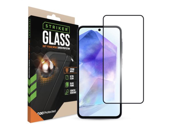 Striker D3O Xtreme Impact Glass Screen Protector – Black Frame – Samsung Galaxy A35 5G/A36 5G/A55 5G/A56 5G/S24 FE 5G