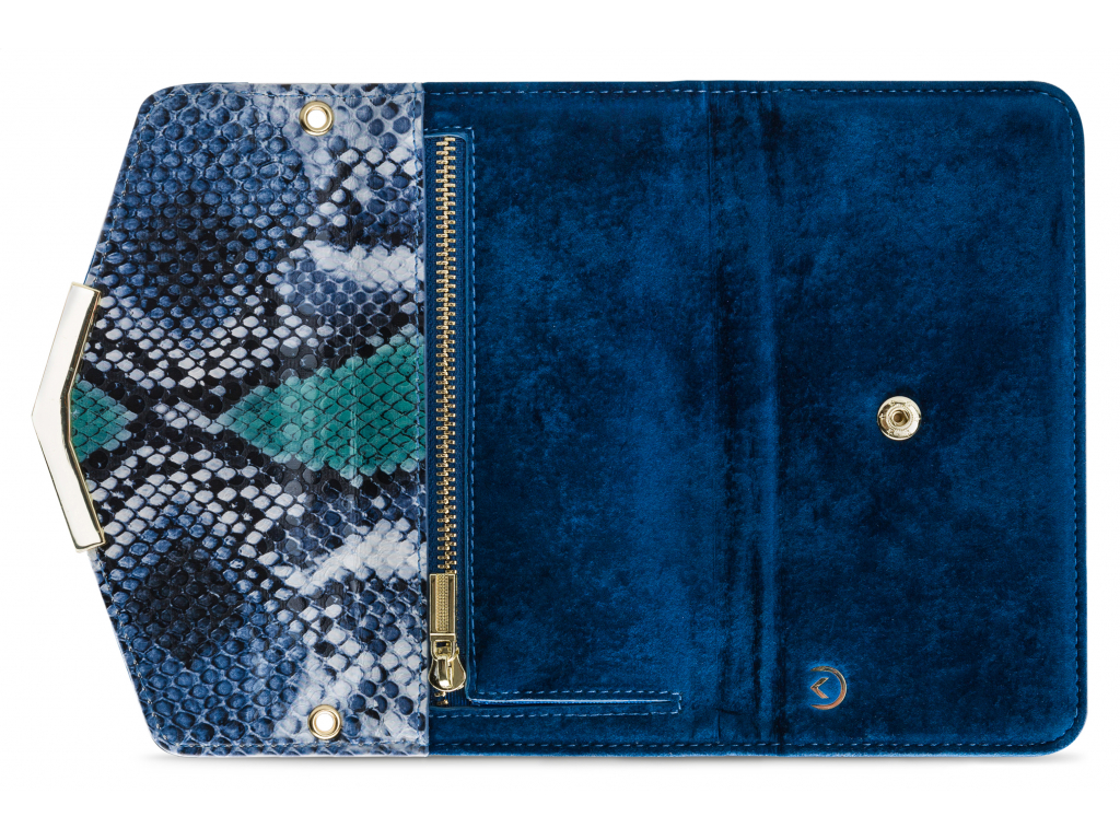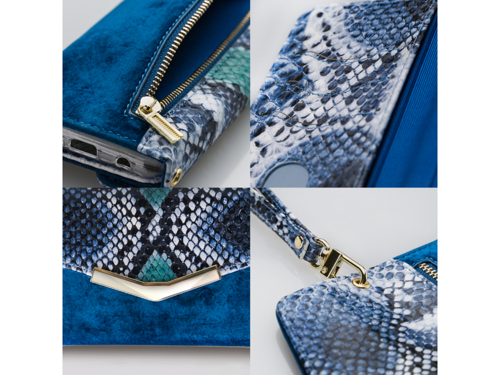 Het gebruik van de verschillende materialen en de hoge mate van afwerking maken de Clutch een unieke case. De buitenkant van de wallet is een combinatie van materiaal met een gedetailleerde slangenleren look en van materiaal met een zachte, luxe fluwele feel. Dit zet zich voort aan de binnenkant, de achterkant van de cover en de handige pols-strap, zodat alles goed bij elkaar past.