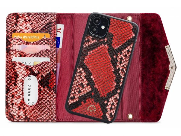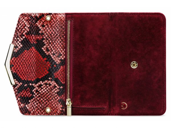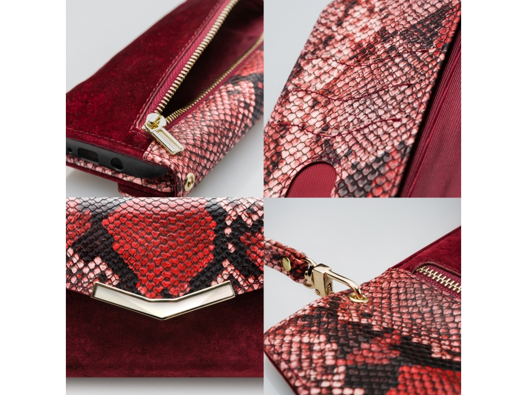 Het gebruik van de verschillende materialen en de hoge mate van afwerking maken de Clutch een unieke case. De buitenkant van de wallet is een combinatie van materiaal met een gedetailleerde slangenleren look en van materiaal met een zachte, luxe fluwele feel. Dit zet zich voort aan de binnenkant, de achterkant van de cover en de handige pols-strap, zodat alles goed bij elkaar past.