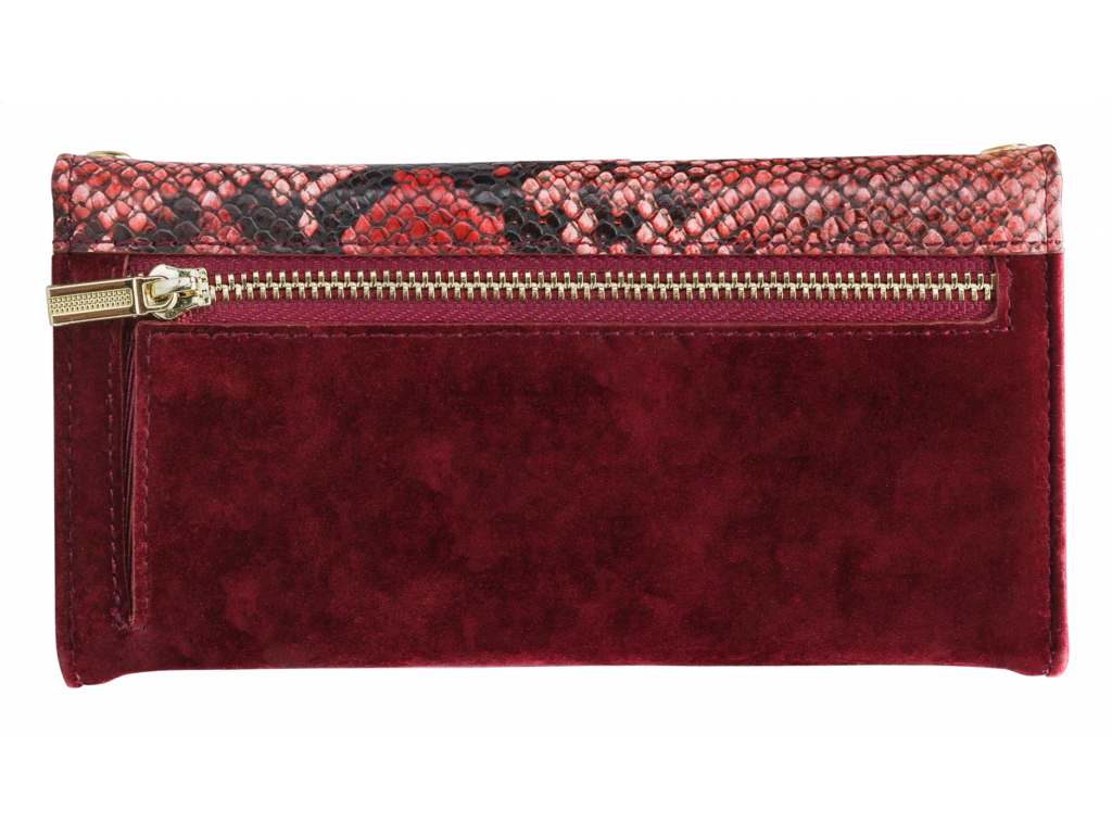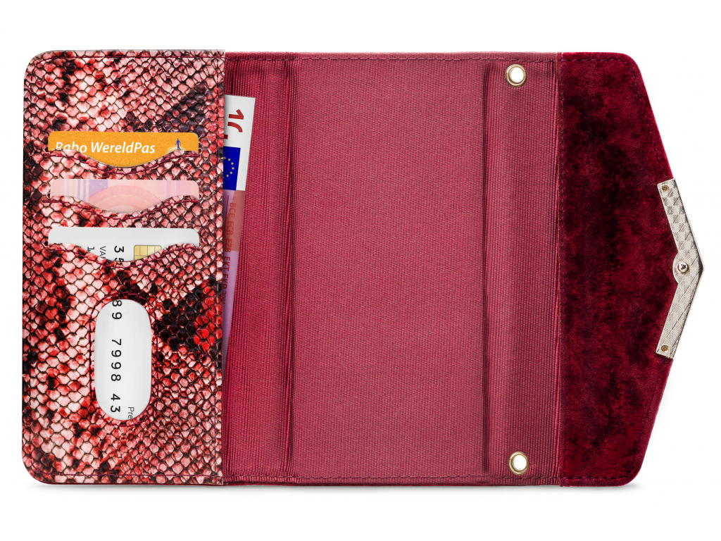 Het gebruik van de verschillende materialen en de hoge mate van afwerking maken de Clutch een unieke case. De buitenkant van de wallet is een combinatie van materiaal met een gedetailleerde slangenleren look en van materiaal met een zachte, luxe fluwele feel. Dit zet zich voort aan de binnenkant, de achterkant van de cover en de handige pols-strap, zodat alles goed bij elkaar past.