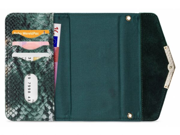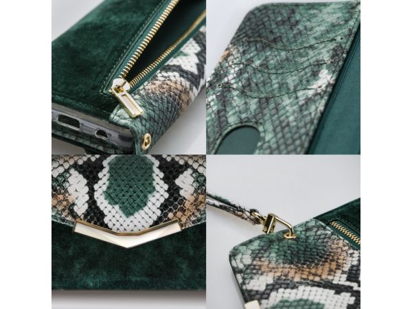 Het gebruik van de verschillende materialen en de hoge mate van afwerking maken de Clutch een unieke case. De buitenkant van de wallet is een combinatie van materiaal met een gedetailleerde slangenleren look en van materiaal met een zachte, luxe fluwele feel. Dit zet zich voort aan de binnenkant, de achterkant van de cover en de handige pols-strap, zodat alles goed bij elkaar past.