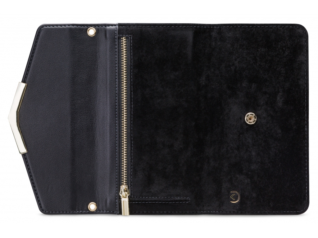Het gebruik van de verschillende materialen en de hoge mate van afwerking maken de Clutch een unieke case. De buitenkant van de wallet is een combinatie van materiaal met een gedetailleerde slangenleren look en van materiaal met een zachte, luxe fluwele feel. Dit zet zich voort aan de binnenkant, de achterkant van de cover en de handige pols-strap, zodat alles goed bij elkaar past.