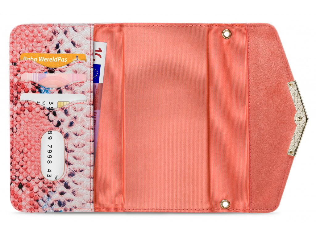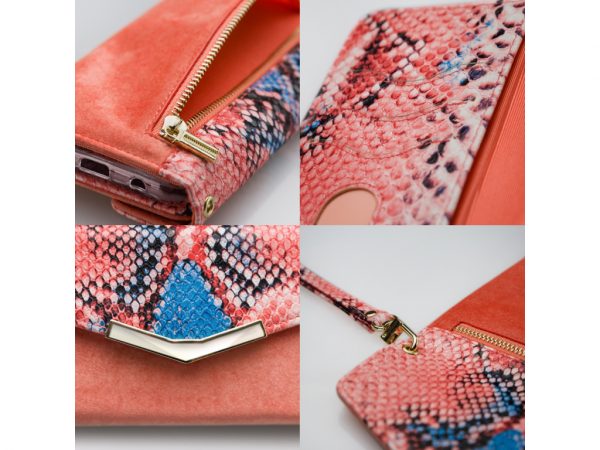 Het gebruik van de verschillende materialen en de hoge mate van afwerking maken de Clutch een unieke case. De buitenkant van de wallet is een combinatie van materiaal met een gedetailleerde slangenleren look en van materiaal met een zachte, luxe fluwele feel. Dit zet zich voort aan de binnenkant, de achterkant van de cover en de handige pols-strap, zodat alles goed bij elkaar past.