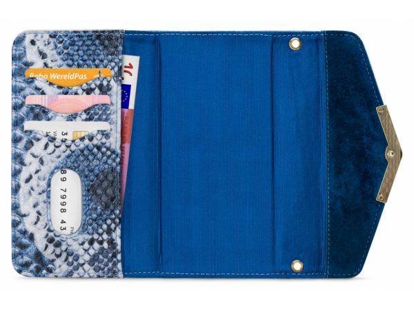 Het gebruik van de verschillende materialen en de hoge mate van afwerking maken de Clutch een unieke case. De buitenkant van de wallet is een combinatie van materiaal met een gedetailleerde slangenleren look en van materiaal met een zachte, luxe fluwele feel. Dit zet zich voort aan de binnenkant, de achterkant van de cover en de handige pols-strap, zodat alles goed bij elkaar past.