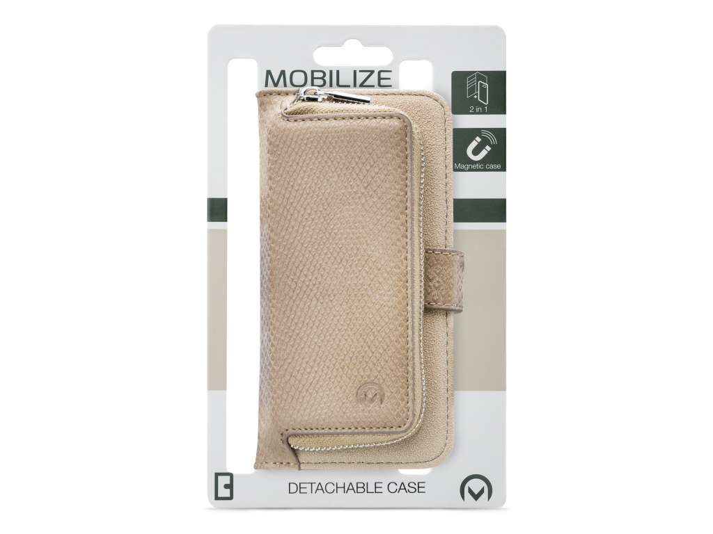 Met de luxueuze Mobilize 2in1 Gelly Wallet Zipper Case heeft u altijd al uw spullen bij elkaar voor een dagje winkelen of een avond uit.  Binnenin de case zitten drie vakjes voor uw ID kaart, bankpas of klantenkaarten. Eén van die vakjes heeft een handige slide functie om uw meest gebruikte pas nog makkelijker uit het vakje te krijgen. Er zit ook een groter vak voor papiergeld of andere papieren in. De voorkant van de modieuze Gelly Wallet Zipper Case is een mooi afgewerkte portemonnee met rits. Perfect voor uw sleutels en voor spullen die u én snel bij de hand én veilig opgeborgen wil hebben. Het elegante polsbandje, het subtiele lizard motiefje en de zilverkleurige sluitingen maken van deze case een echt fashion item.