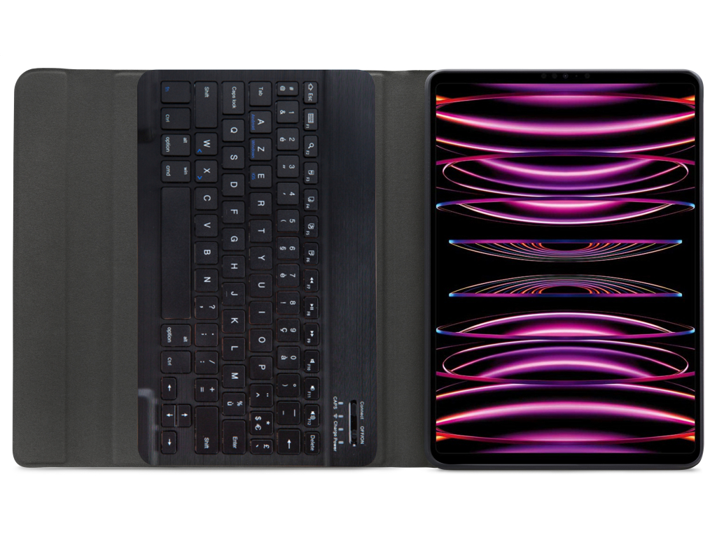 Dankzij gleuven aan de binnenkant van de case is de tablet is in 3 verschillende standen te zetten voor beter zicht op het scherm tijdens het typen van je document of Teams-vergadering. Door middel van Bluetooth maakt u verbinding met het AZERTY-toetsenbord. Het uitneembare toetsenbord is licht van gewicht, heeft een solide bouw zodat het comfortabel typt en zit met sterke magneten stevig vast in de case. Een extra laag microfiber onder het toetsenbord zorgt er ook nog eens voor dat het niet weg zal glijden tijdens gebruik en voor extra stevigheid. In de flap van de case zit ook een sterke magneet die de gehele case netjes afsluit.