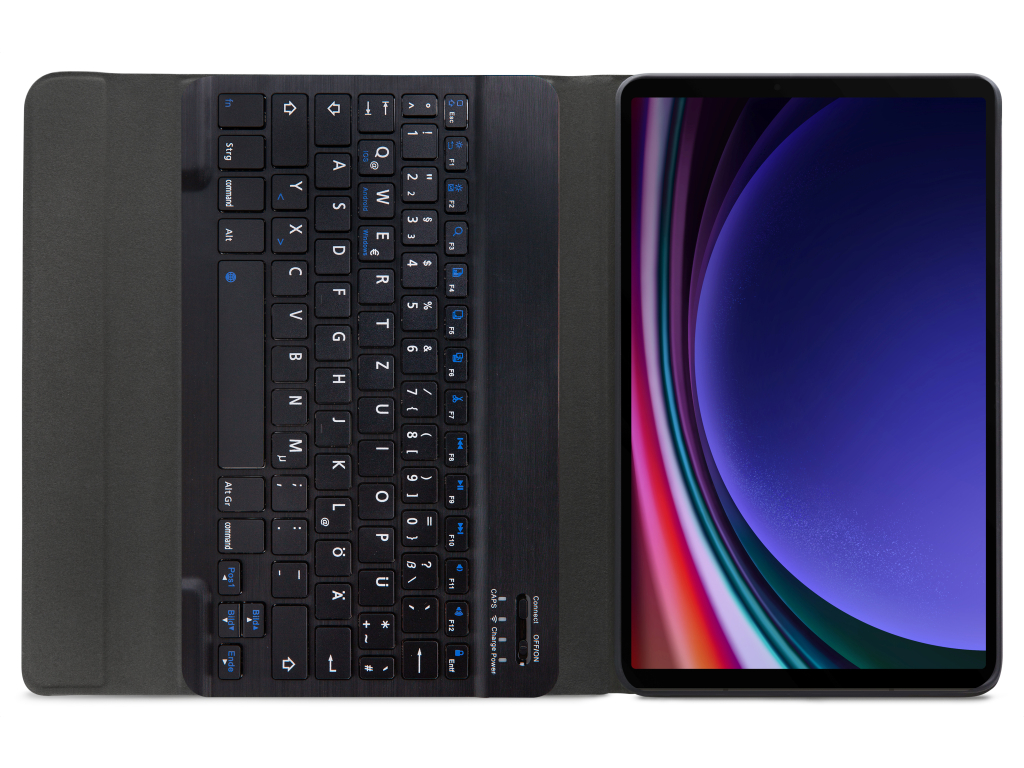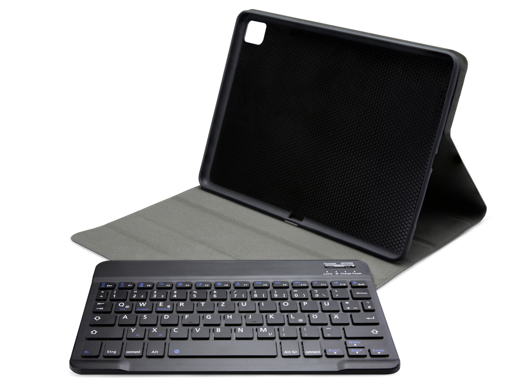 Dankzij gleuven aan de binnenkant van de case is de tablet is in 3 verschillende standen te zetten voor beter zicht op het scherm tijdens het typen van je document of Teams-vergadering. Door middel van Bluetooth maakt u verbinding met het QWERTZ-toetsenbord. Het uitneembare toetsenbord is licht van gewicht, heeft een solide bouw zodat het comfortabel typt en zit met sterke magneten stevig vast in de case. Een extra laag microfiber onder het toetsenbord zorgt er ook nog eens voor dat het niet weg zal glijden tijdens gebruik en voor extra stevigheid. In de flap van de case zit ook een sterke magneet die de gehele case netjes afsluit.