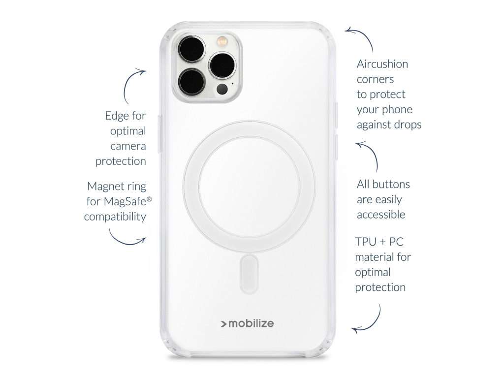 Bij de vernieuwde Mobilize Naked Protection Case komt het beste van een beschermende en Magsafe compatible case samen. De achterzijde van de case is van stevig kunststof wat jouw mobiel beschermt tegen krassen, maar zonder afbreuk te doen aan het design van jouw telefoon. De randen van de case zijn juist van flexibel materiaal. Zo kunnen vallen en stoten goed worden opgevangen en blijft jouw telefoon langer schadevrij. Het zorgt bovendien voor een betere grip zodat jij jouw mobiel minder snel laat vallen.