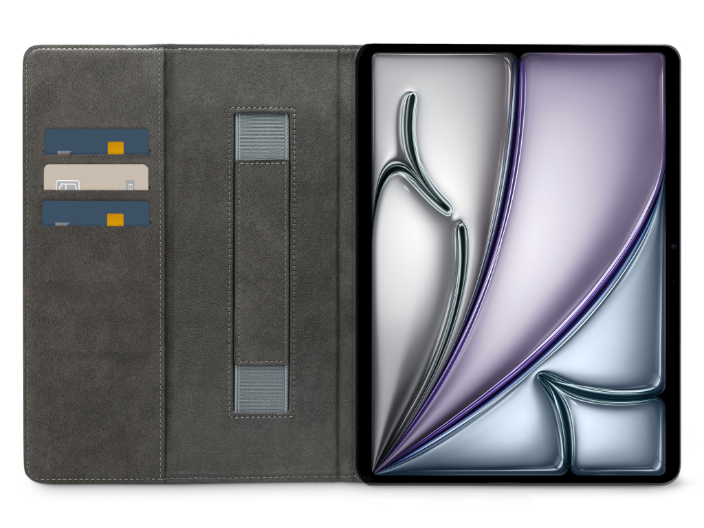 Aan de linker binnenkant van de case vind je drie vakjes waar je pasjes, briefgeld en visitekaartjes kunt opbergen. De case is voorzien van een handige stand functie, waardoor je je tablet gemakkelijk kunt neerzetten om bijvoorbeeld video's te kijken of foto's te bekijken. Bovendien heeft de case aan de linker binnenkant een handige band waar je je hand doorheen kunt steken om je tablet stevig vast te houden.
