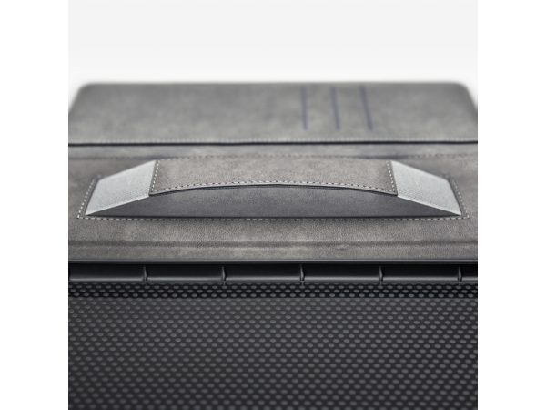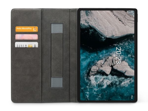 Aan de linker binnenkant van de case vind je drie vakjes waar je pasjes, briefgeld en visitekaartjes kunt opbergen. De case is voorzien van een handige stand functie, waardoor je je tablet gemakkelijk kunt neerzetten om bijvoorbeeld video's te kijken of foto's te bekijken. Bovendien heeft de case aan de linker binnenkant een handige band waar je je hand doorheen kunt steken om je tablet stevig vast te houden.