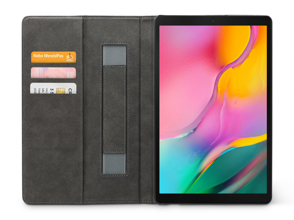 Aan de linker binnenkant van de case vind je drie vakjes waar je pasjes, briefgeld en visitekaartjes kunt opbergen. De case is voorzien van een handige stand functie, waardoor je je tablet gemakkelijk kunt neerzetten om bijvoorbeeld video's te kijken of foto's te bekijken. Bovendien heeft de case aan de linker binnenkant een handige band waar je je hand doorheen kunt steken om je tablet stevig vast te houden.