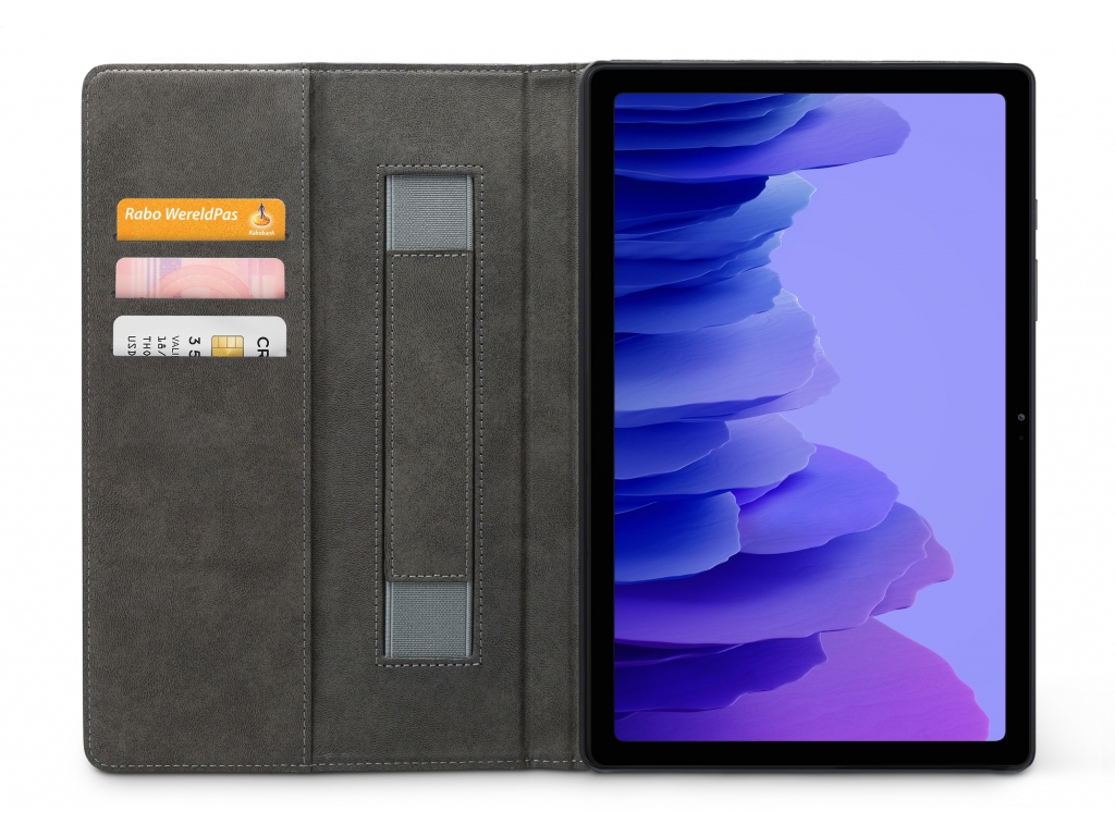 Aan de linker binnenkant van de case vind je drie vakjes waar je pasjes, briefgeld en visitekaartjes kunt opbergen. De case is voorzien van een handige stand functie, waardoor je je tablet gemakkelijk kunt neerzetten om bijvoorbeeld video's te kijken of foto's te bekijken. Bovendien heeft de case aan de linker binnenkant een handige band waar je je hand doorheen kunt steken om je tablet stevig vast te houden.