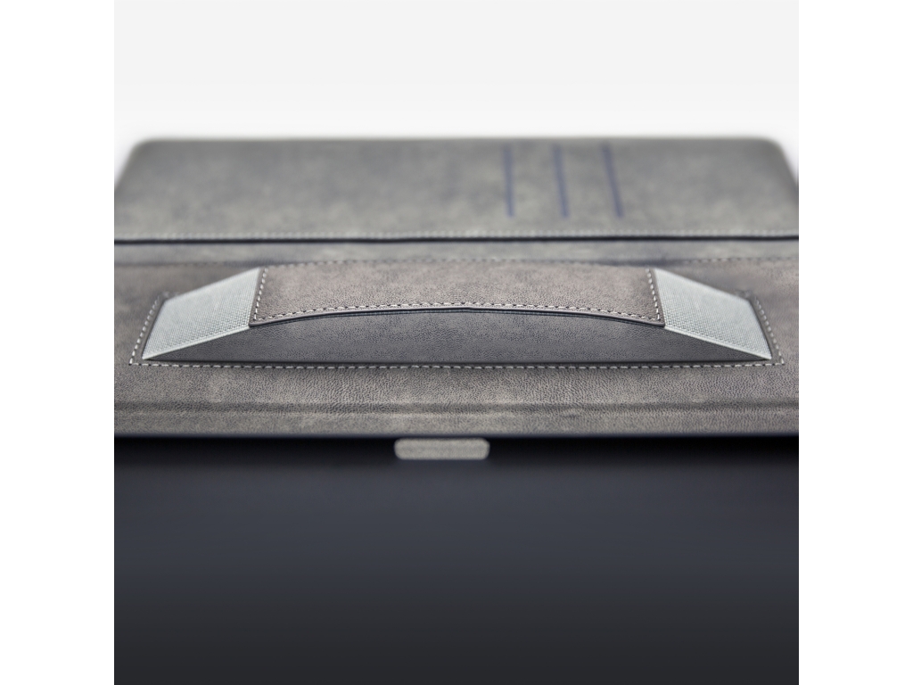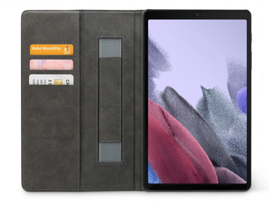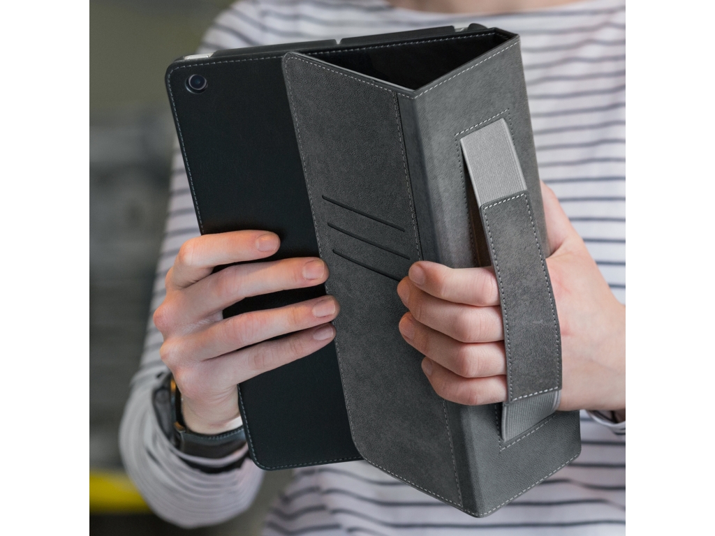 Aan de linker binnenkant van de case vind je drie vakjes waar je pasjes, briefgeld en visitekaartjes kunt opbergen. De case is voorzien van een handige stand functie, waardoor je je tablet gemakkelijk kunt neerzetten om bijvoorbeeld video's te kijken of foto's te bekijken. Bovendien heeft de case aan de linker binnenkant een handige band waar je je hand doorheen kunt steken om je tablet stevig vast te houden.