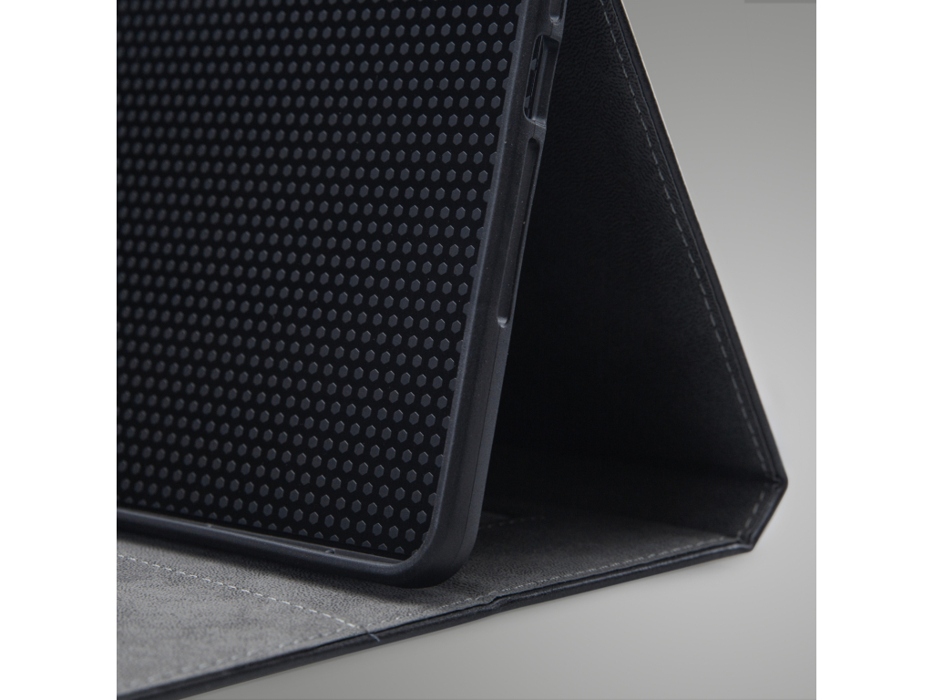Aan de linker binnenkant van de case vind je drie vakjes waar je pasjes, briefgeld en visitekaartjes kunt opbergen. De case is voorzien van een handige stand functie, waardoor je je tablet gemakkelijk kunt neerzetten om bijvoorbeeld video's te kijken of foto's te bekijken. Bovendien heeft de case aan de linker binnenkant een handige band waar je je hand doorheen kunt steken om je tablet stevig vast te houden.