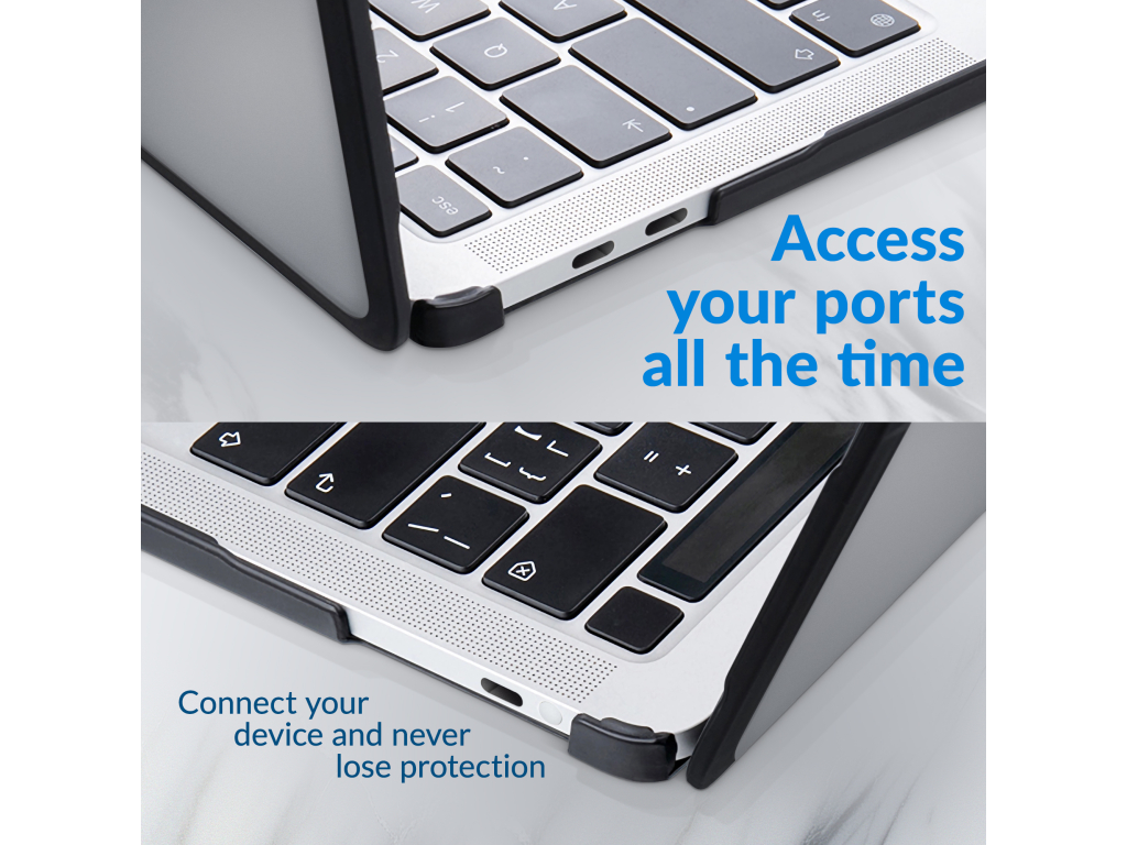 De cover is voorzien van handige uitsparingen, zodat je probleemloos toegang hebt tot alle belangrijke connectoren. Aan de onderkant van de hoes vind je strategisch geplaatste cutouts die zorgen voor een optimale luchtstroom en efficiënte warmteafvoer. Daarnaast beschikt de onderkant over anti-slip rubberen voetjes die ervoor zorgen dat je MacBook stevig op zijn plaats blijft liggen, zelfs op gladde oppervlakken. Zo blijft je laptop beschermd en stabiel, terwijl je ongestoord kunt werken of genieten.