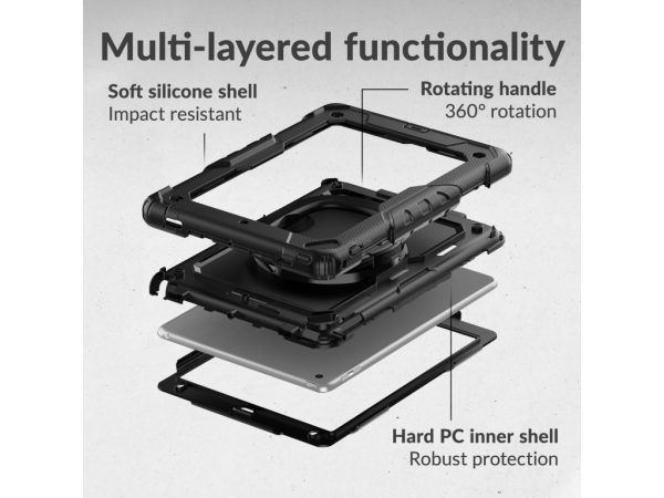 Mobilize Rotating Defender Case with Stand Function biedt ongeëvenaarde bescherming voor jouw tablet dankzij een tweevoudige beschermingslaag. Deze case combineert twee beschermingslagen voor maximale veiligheid. Een schokabsorberende siliconen bumper en een hard plastic frame beschermen je tablet tegen stoten, krassen en vuil.