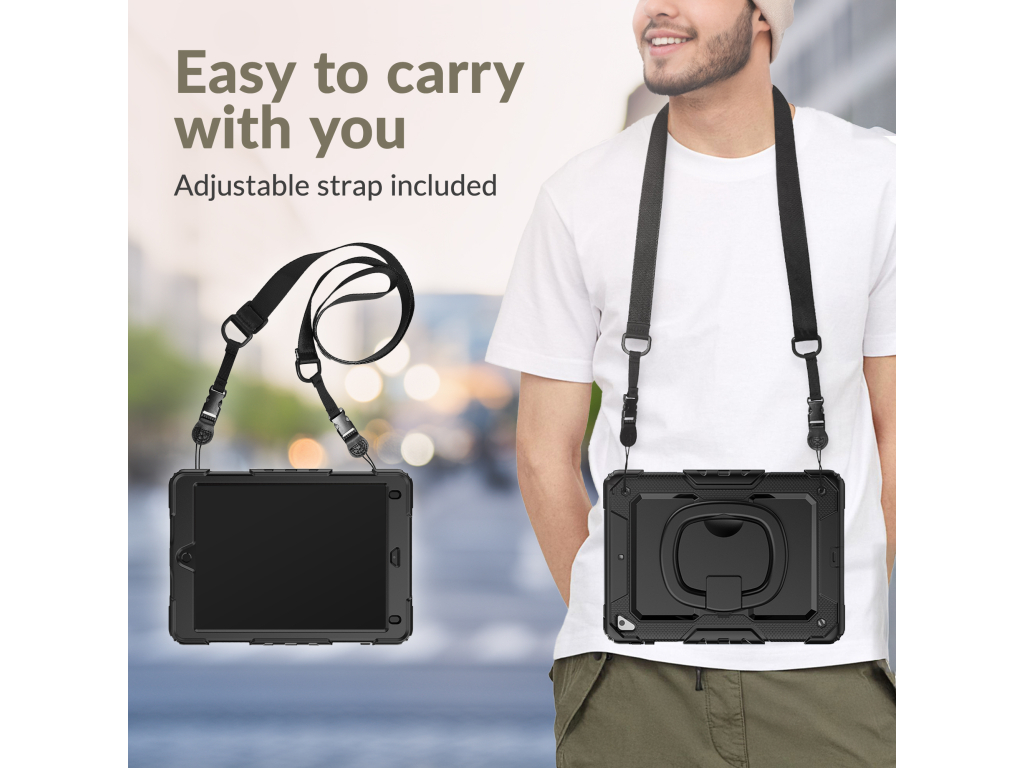 Siliconen pluggen voorkomen dat connectoren en poorten beschadigd raken door externe elementen of dat hier stof en zand in gaan ophopen. De meegeleverde schouderriem maakt het gemakkelijk om je tablet overal mee naartoe te nemen, ideaal voor onderweg of op locatie.