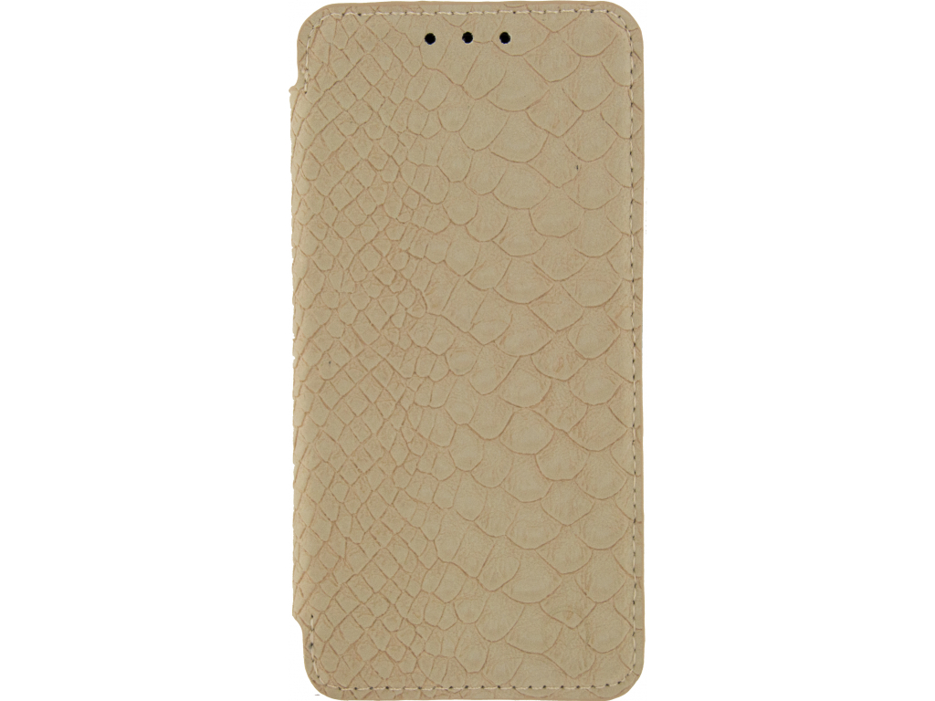 Met de Slim Booklet serie heeft u wel een heel bijzondere case in handen. Dit product is namelijk een combinatie van een zachte Gelly en een book case. De flap aan de voorkant is gemaakt van kunstleer en voorzien van een slangenleerprint. Het materiaal voelt prettig aan en is zacht als suède. Er is een uitsparing gemaakt voor de speaker. Aan de binnenkant zit microvezel, wat bijdraagt om uw beeldscherm vlek- en krasvrij te houden. Er is hier ruimte voor een pasje, visitekaartje of briefgeld. De flap is vastgemaakt aan een transparante softcase. Zo zijn ook de achterkant en hoeken van uw telefoon beschermd tegen schade, maar dan op een minimalistische manier. Het originele design van telefoon blijft nog goed zichtbaar. Hierdoor is de case veel subtieler dan een gewone book case, maar biedt het wel dezelfde voordelen.