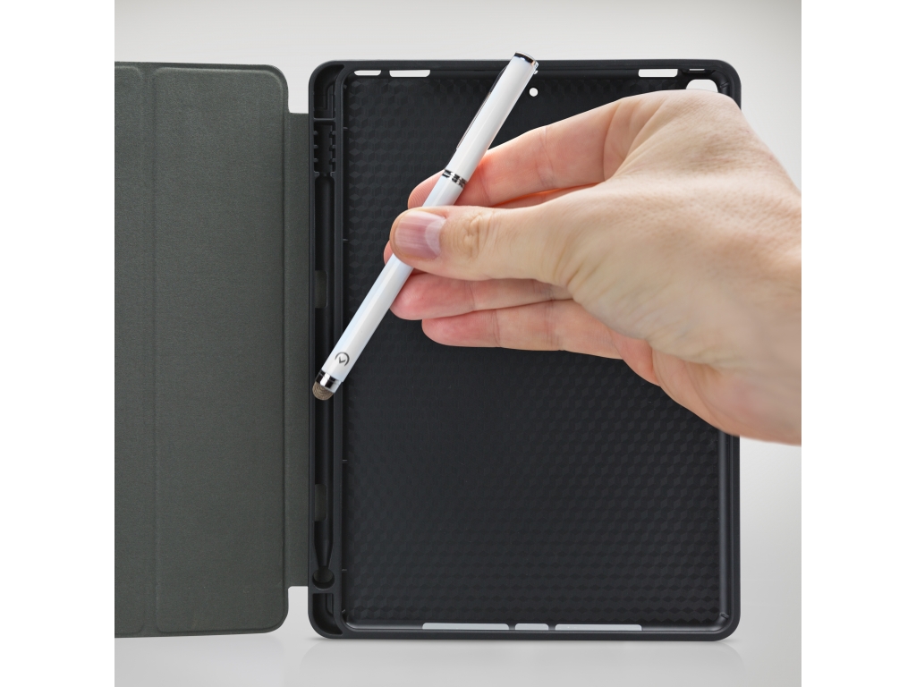 De binnenkant is bedekt met zacht microfiber om het scherm extra goed te beschermen. Ook kun je hier je (stylus) pen kwijt. Aan alle uitsparingen is gedacht. Je apparaat blijft volledig bedienbaar, oplaadbaar en ook kun je gewoon foto’s en video’s blijven maken.