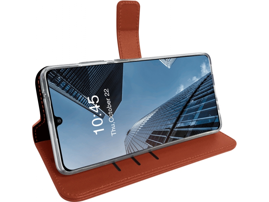 Deze bruin leren Book Case voor de Samsung Galaxy A41 is de ideale combinatie van een stijlvolle telefoonhoes en een portemonnee. Dit telefoonhoesje is handgemaakt om een perfecte pasvorm en optimale bescherming te garanderen en tevens de levensduur van je Samsung te verlengen.