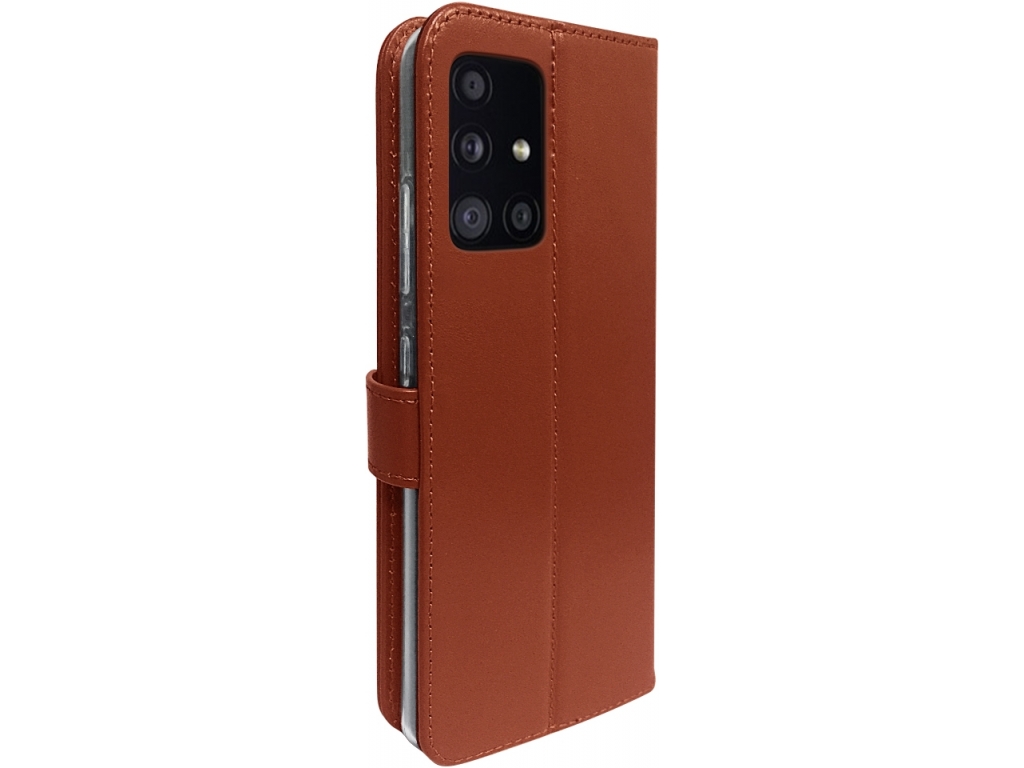Deze bruin leren Book Case voor de Samsung Galaxy A51 is de ideale combinatie van een stijlvolle telefoonhoes en een portemonnee. Dit telefoonhoesje is handgemaakt om een perfecte pasvorm en optimale bescherming te garanderen en tevens de levensduur van je Samsung te verlengen.